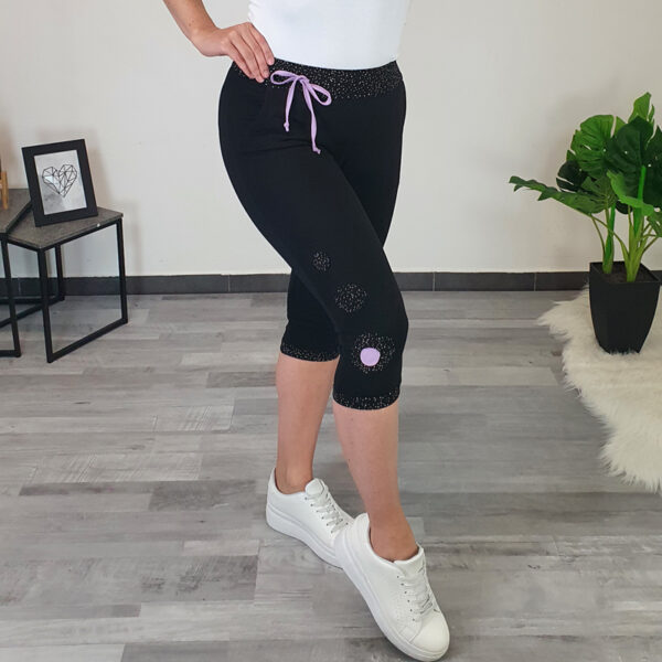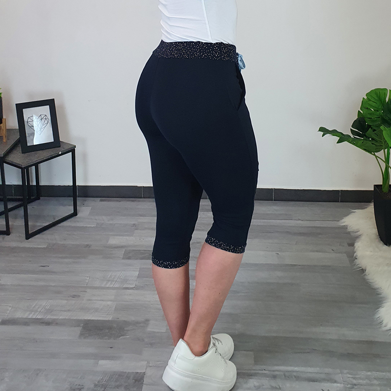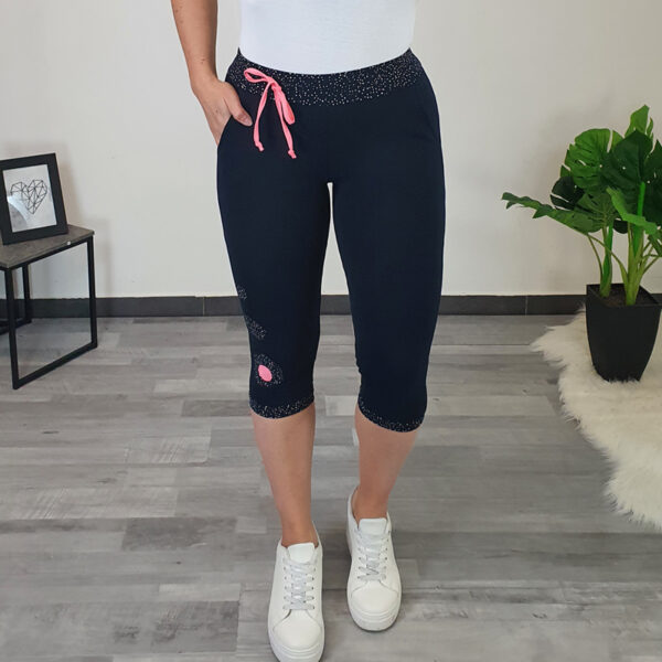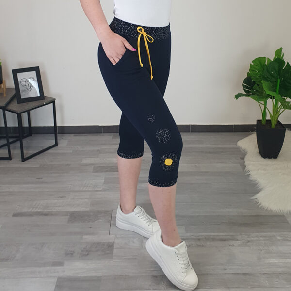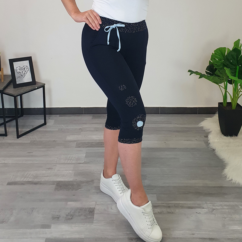 Ženske 3/4 hlače Olga u tamnoplavoj boji. Hlače imaju džepove, u struku je dodan točkasti patent i plava vrpca. Na lijevoj nogavici dodani su točkasti krugovi. Hlače su izrađene od pamuka i vrlo su elastične. Dostupne su od veličine 36 do 46.