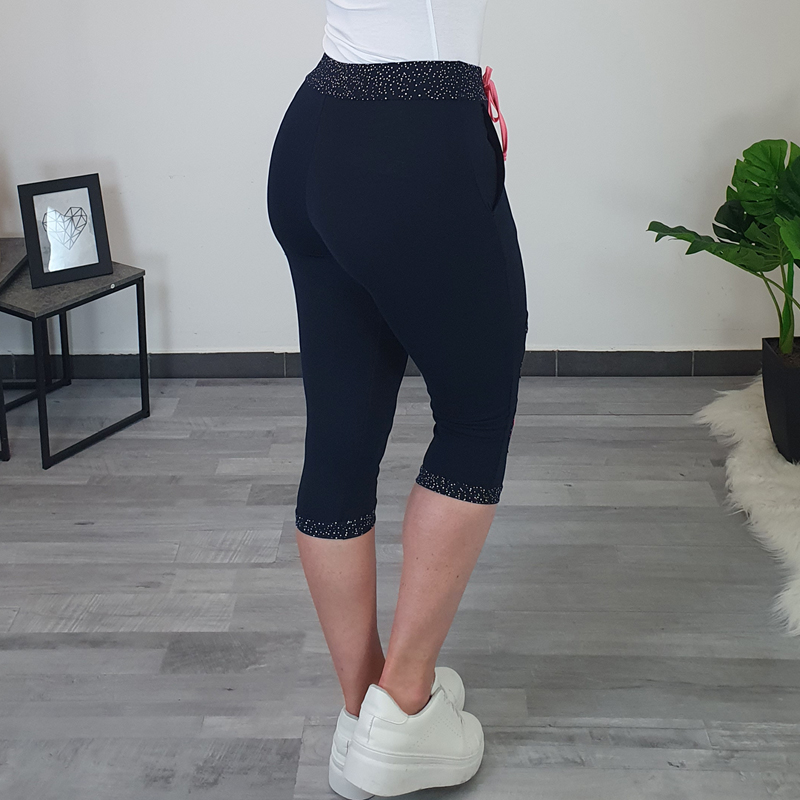 Ženske 3/4 hlače Olga u tamnoplavoj boji. Hlače imaju džepove, u struku je dodan točkasti patent i ružičasta vrpca. Na lijevoj nogavici dodani su točkasti krugovi. Hlače su izrađene od pamuka i vrlo su elastične. Dostupne su od veličine 36 do 52.