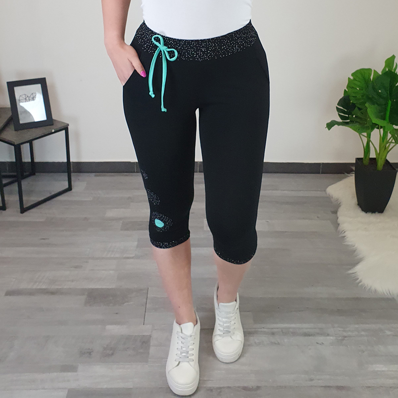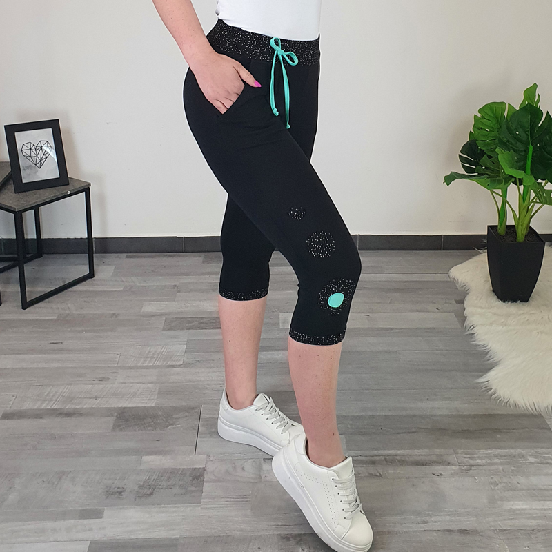 Ženske 3/4 hlače Olga u crnoj boji. Hlače imaju džepove, u struku je dodan točkasti patent i zelena vrpca. Na lijevoj nogavici dodani su točkasti krugovi. Hlače su izrađene od pamuka i vrlo su elastične. Dostupne su od veličine 36 do 52.