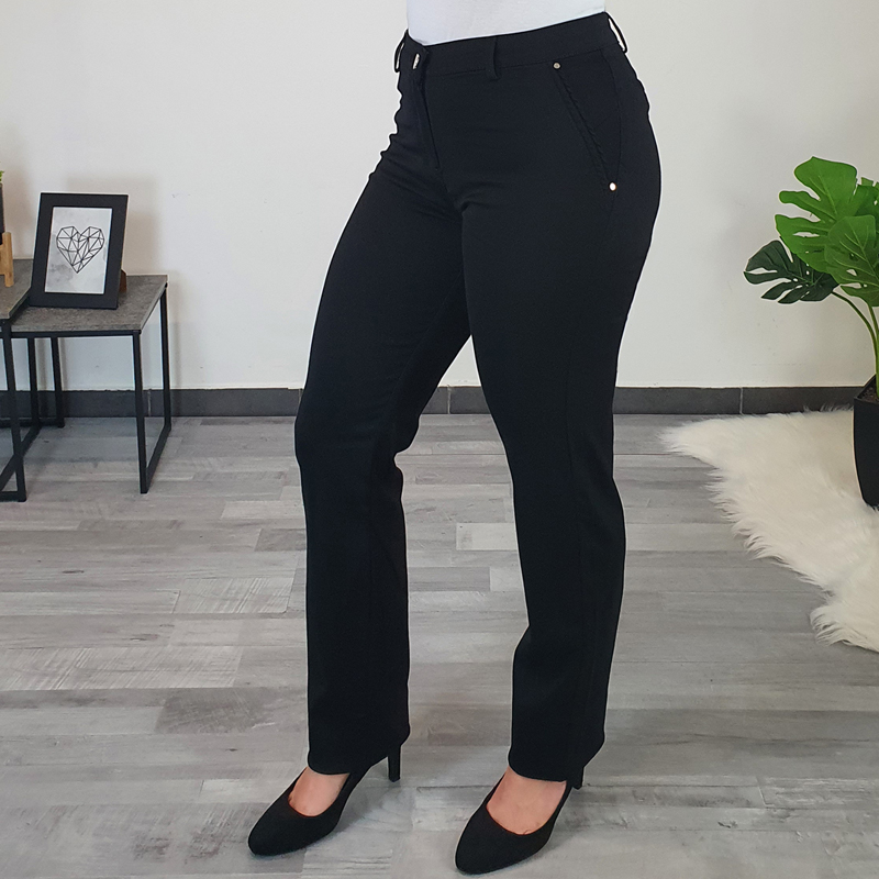 Trebate li udobne i kvalitetne hlače, onda su hlače Denisa 10420 u crnoj boji najbolji izbor. Hlače su vrlo elastične i udobne, struk je srednje visok, a nogavice su široke i dugačke (dužina 34). Hlače imaju dva džepa sprijeda i dva džepa straga. Hlače su prikladne za sve prilike i u njima ćete se osjećati nesvakidašnje. Dostupne od broja 42 1/2 pa do broja 50.
