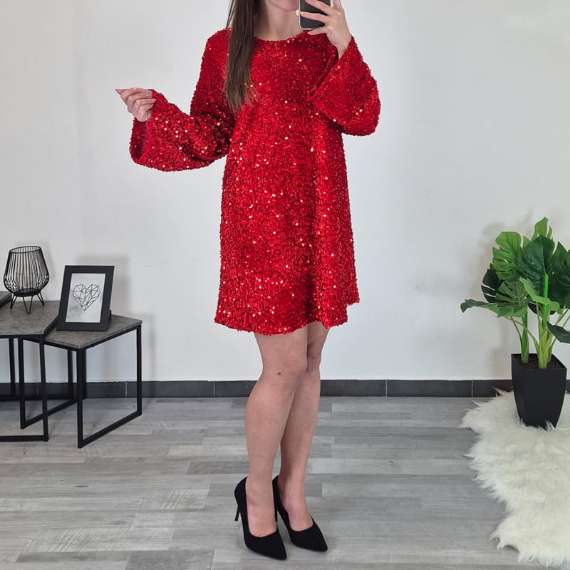 Moderna ženska sjajna haljina u crvenoj boji. Haljina ima šire rukave, leđa blago otvorena na leđima, ukrašena mašnom. Veličina je univerzalna, odgovara od M do XL.