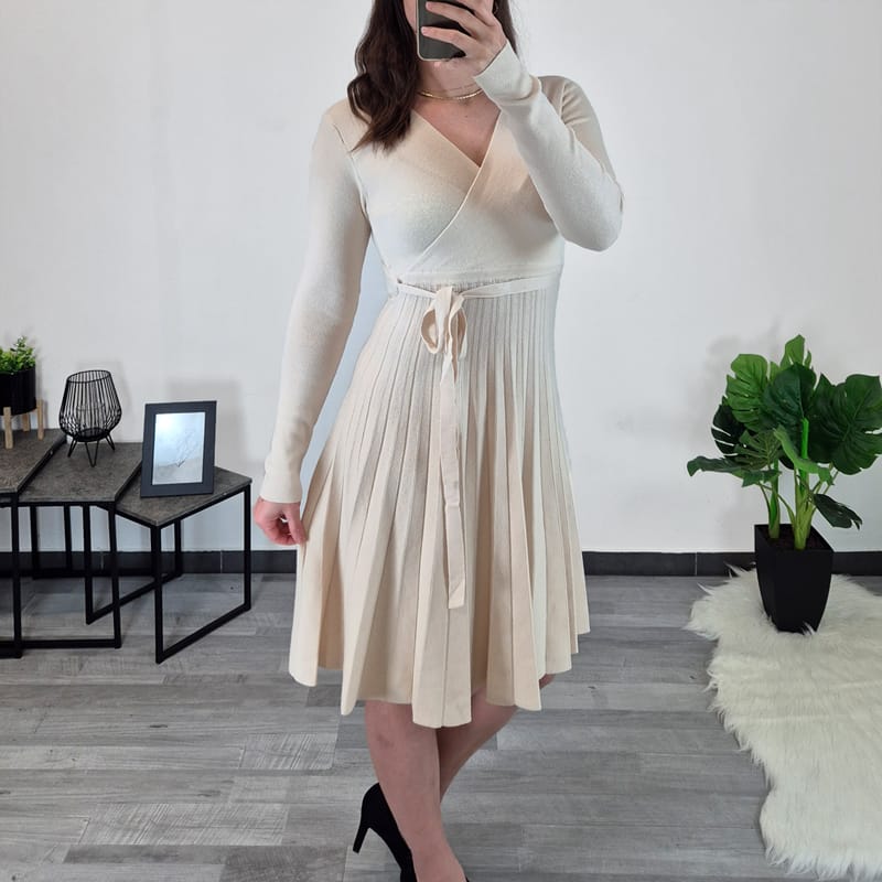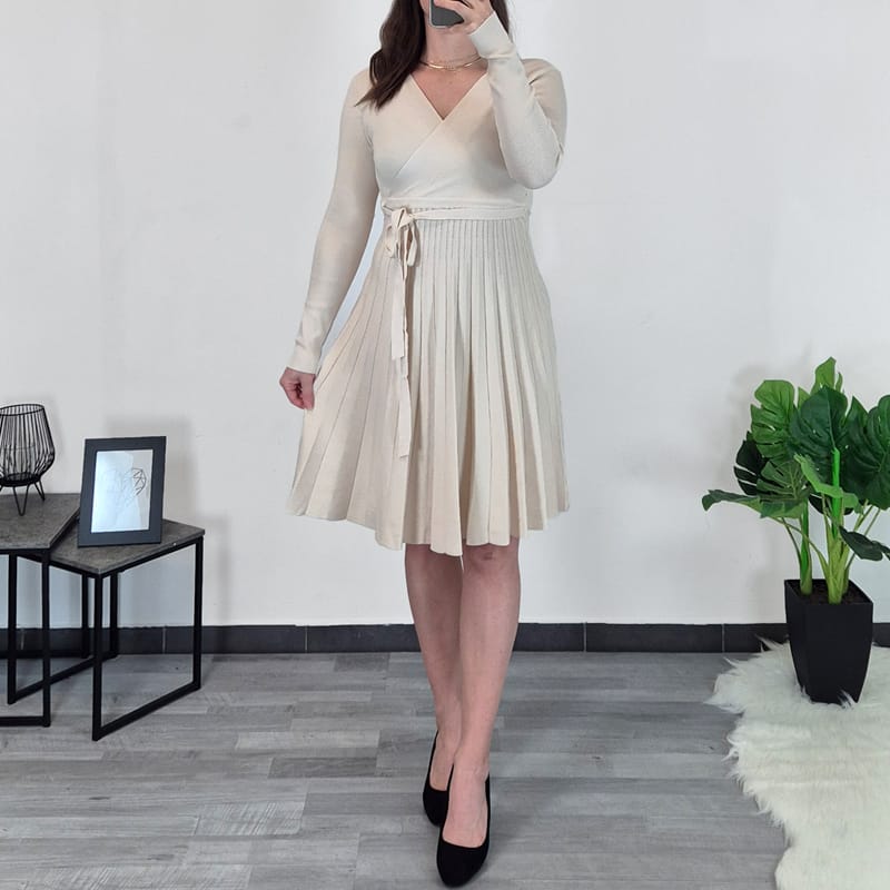 Ženska haljina, pletivo, pogodna za hladne dane. Mekan je na dodir i ugodan za nošenje, materijal je teži i lijepo pada. Haljina ima duge rukave, V izrez s preklopom. Haljina je šira od struka na dolje, a dodan je i remen od istog materijala.