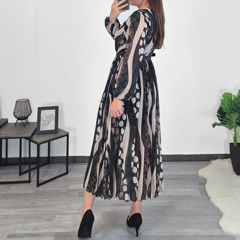 Duga ženska haljina. Haljina je izrađena od prozirne tkanine s uzorkom u bež, crnoj, smeđoj i petrolej zelenoj boji. Ispod haljine je viskozna podstava koja doseže do koljena. Rukavi su dugi i prozirni. U struku ima elastiku, pa se haljina lijepo prilagođava vašoj figuri. Priložen je i remen. Veličina je univerzalna, odgovara veličinama od S do L.