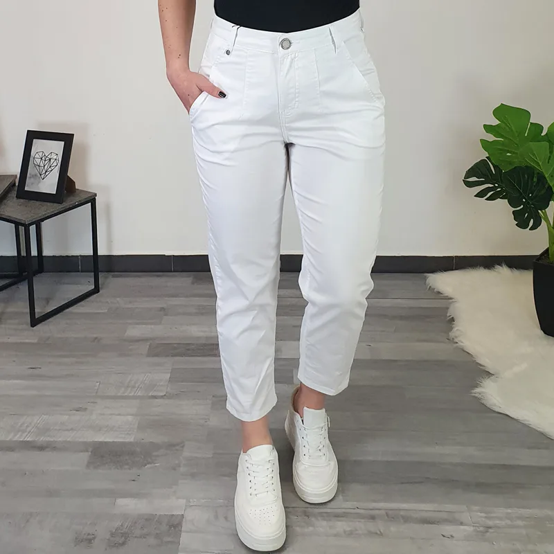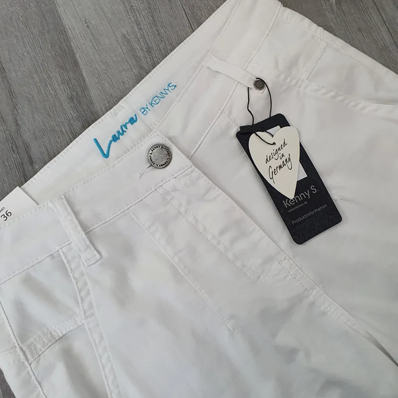 Ženske hlače Kenny S. Hlače su u bijeloj boji, napravljene su od tanjeg pamuka i pogodne su za toplije dane. Hlače kopčaju se patentnim zatvaračem i dugmetom, imaju i džepove.