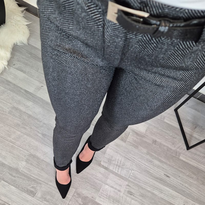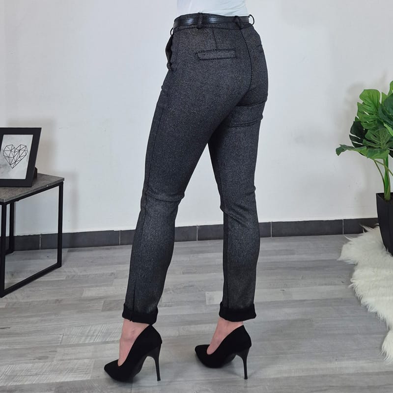 Ženske duge hlače u crnoj boji sa srebrnim uzorkom. Hlače su izrađene od elastičnog materijala i vrlo su udobne. Uz hlače dolazi i crni remen.