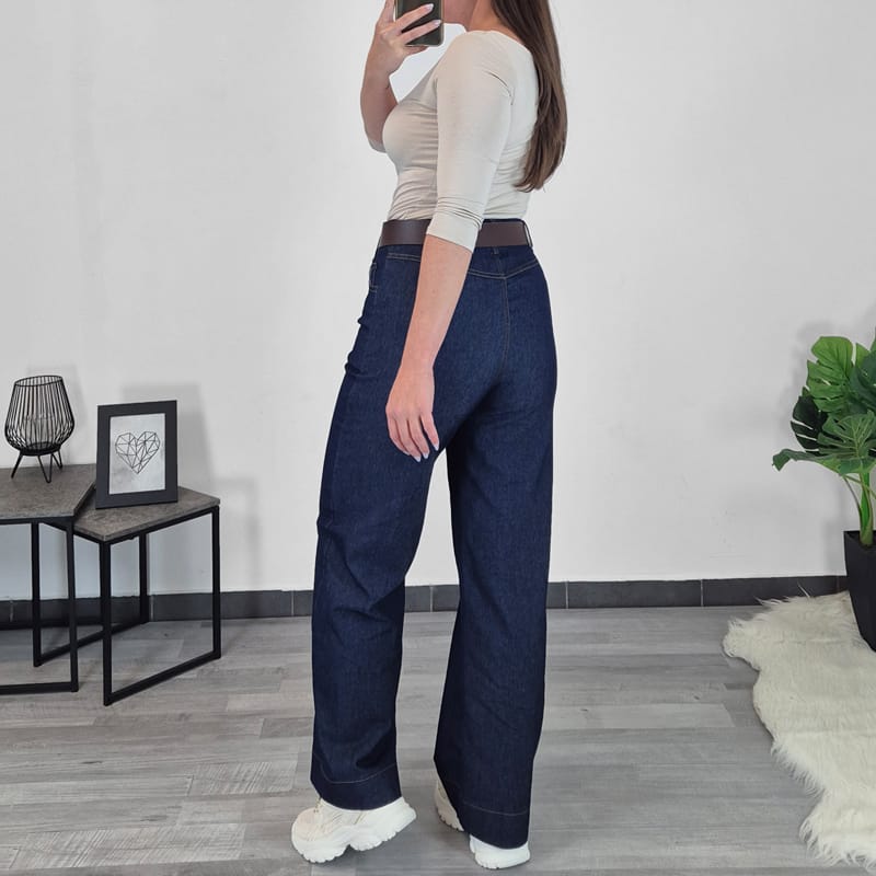 Moderne ženske hlače od trapera. Hlače imaju visoki struk, kopčaju se gumbom i patentnim zatvaračem, a dodana su i dva bočna džepa. Nogavice su duge i široke, ukrašene ukrasnim vanjskim šavom u sredini. Vrlo su elastične i udobne za nošenje. Hlače dolaze sa smeđim remenom.
