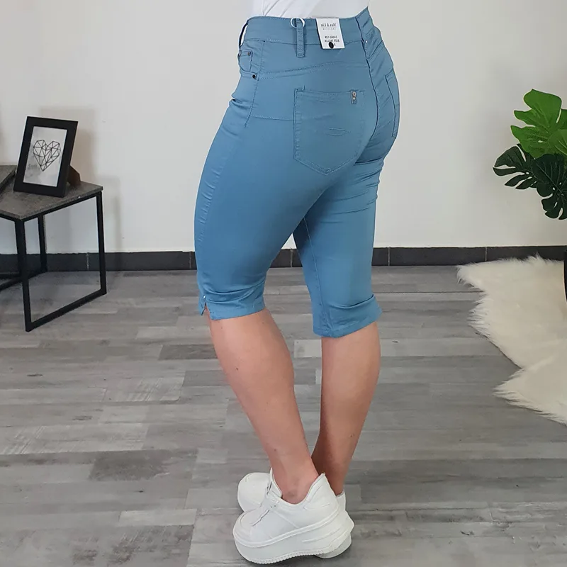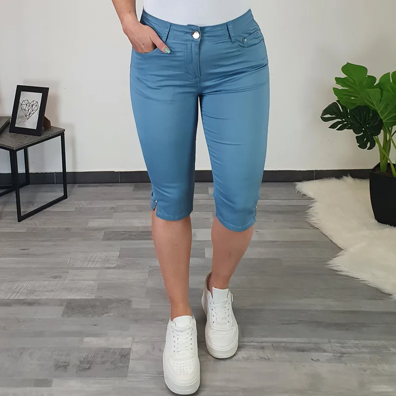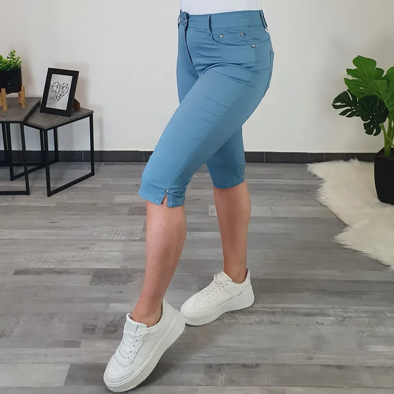 Ženske ljetne hlače u svijetloplavoj boji. Hlače su izrađene od elastičnog i tankog materijala. Hlače su dužine 3/4 i imaju prorez sa strane sa svjetlucavim kamenčićem. Hlače imaju po dva džepa na leđima i na prednjoj strani. Hlače mogu biti odličan izbor za ljetne dane i uljepšati vaš ormar. Dostupne u veličinama od S do 3XL.
