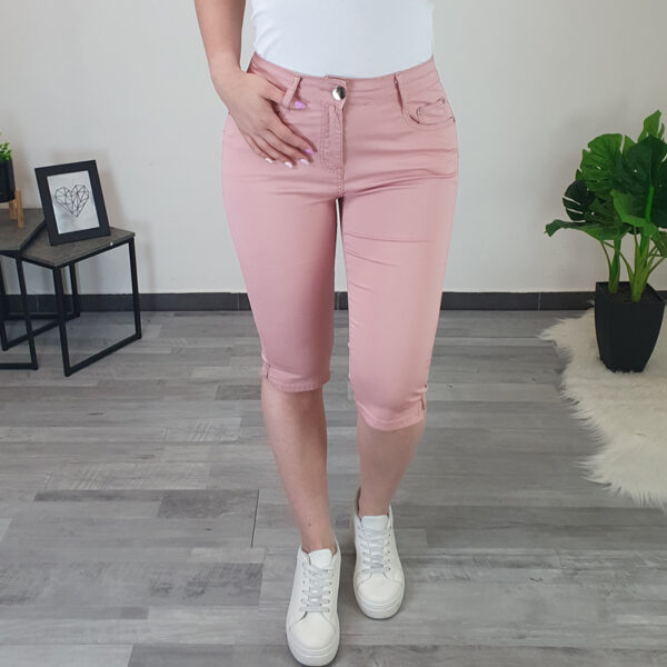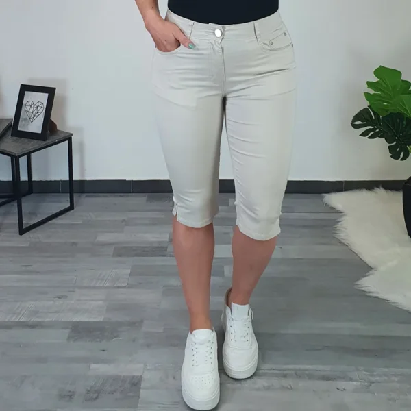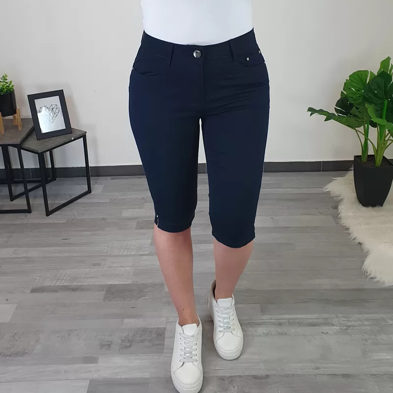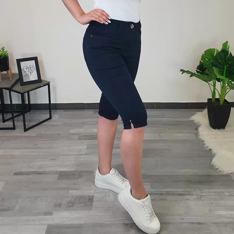 Ženske ljetne hlače u tamnoplavoj boji. Hlače su izrađene od elastičnog i tankog materijala. Hlače su dužine 3/4 i imaju prorez sa strane sa svjetlucavim kamenčićem. Hlače imaju po dva džepa na leđima i na prednjoj strani. Hlače mogu biti odličan izbor za ljetne dane i uljepšati vaš ormar. Dostupne u veličinama od S do 3XL.