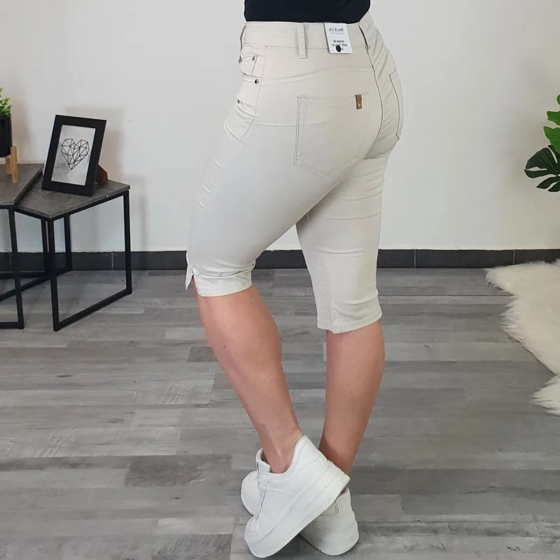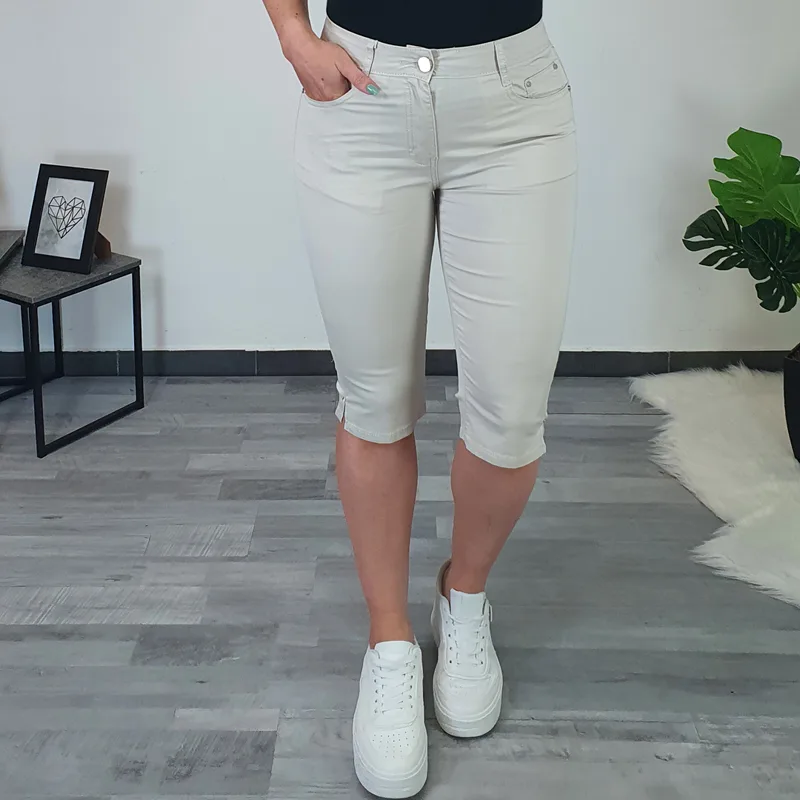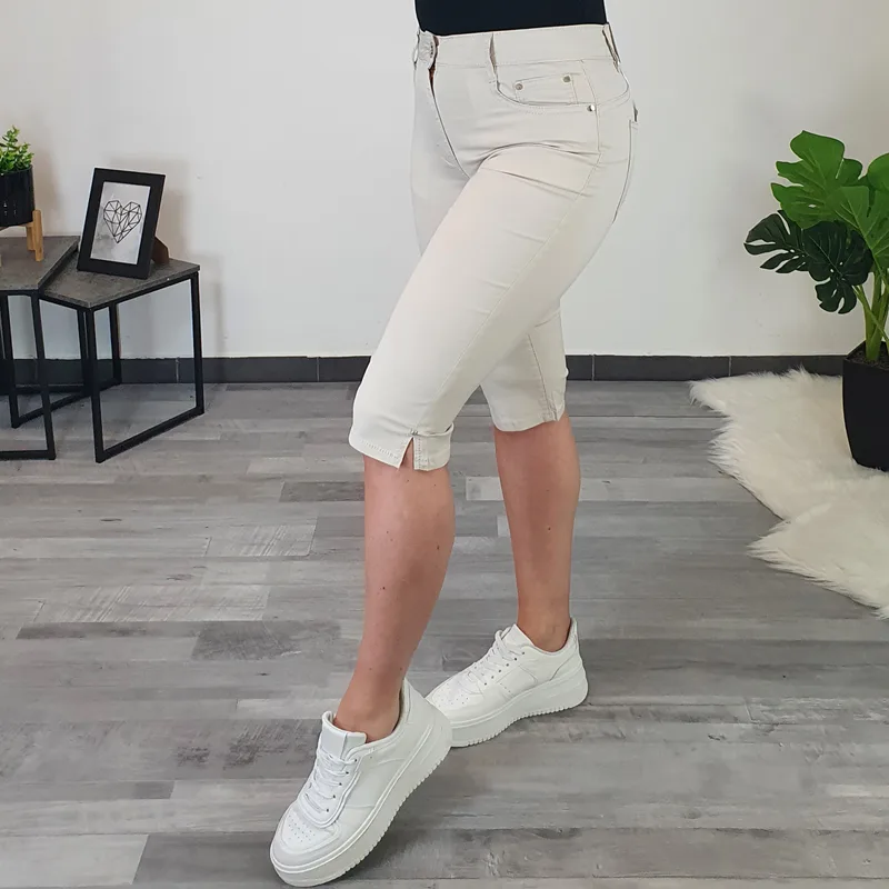 Ženske ljetne hlače u bež boji. Hlače su izrađene od elastičnog i tankog materijala. Hlače su dužine 3/4 i imaju prorez sa strane sa svjetlucavim kamenčićem. Hlače imaju po dva džepa na leđima i na prednjoj strani. Hlače mogu biti odličan izbor za ljetne dane i uljepšati vaš ormar. Dostupne u veličinama od S do 3XL.
