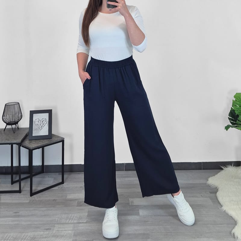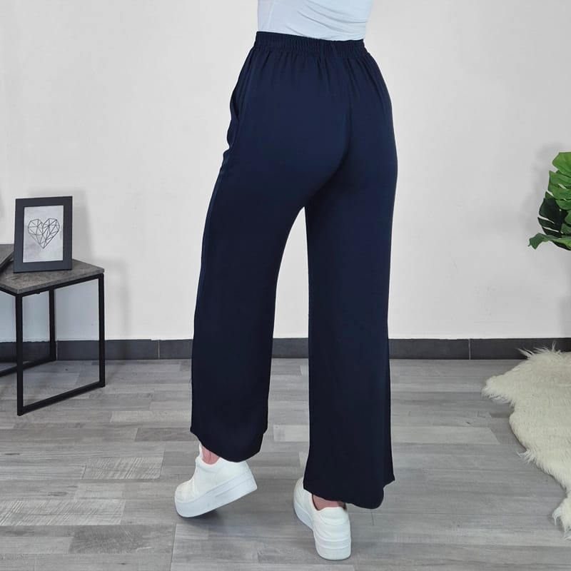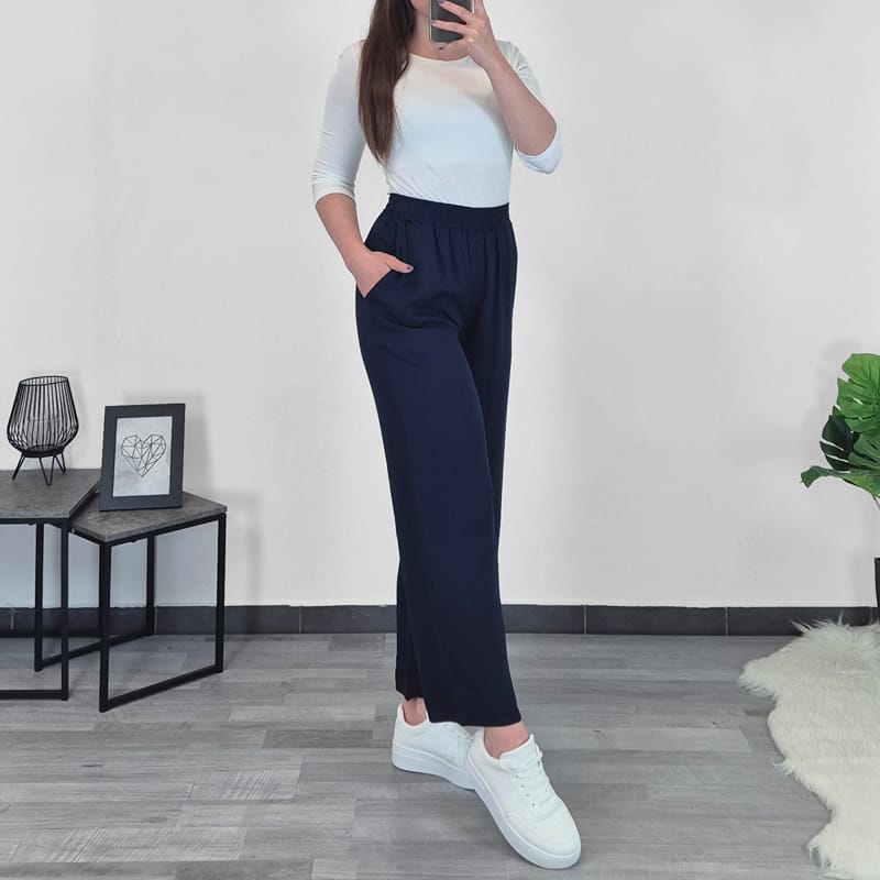 Ženske elegantne hlače u tamnoplavoj boji. Hlače imaju visoki elastični pojas, hlače su široke i duge. Na prednjoj strani imaju dva džepa. Hlače su izrađene od 100% viskoze. Tanke su, lagane, lijepo pristaju i ugodne su za nošenje.