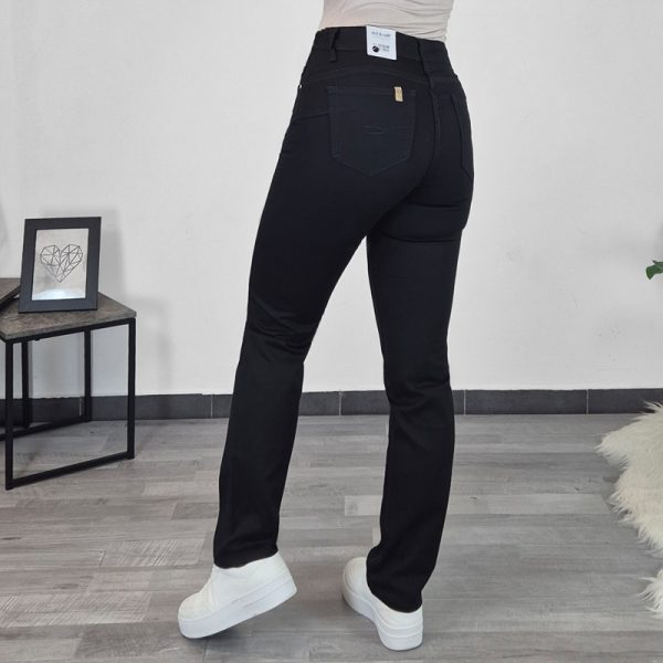 Moderne ženske hlače Iris u crnoj boji. Hlače imaju viši elastični pojas i dva bočna džepa. U struku je dodan ukrasni platneni remen. Nogavice su duge i široke. Hlače su izrađene od visokokvalitetnog pamuka i udobne su za nošenje. Dostupne su od 34 do 48.