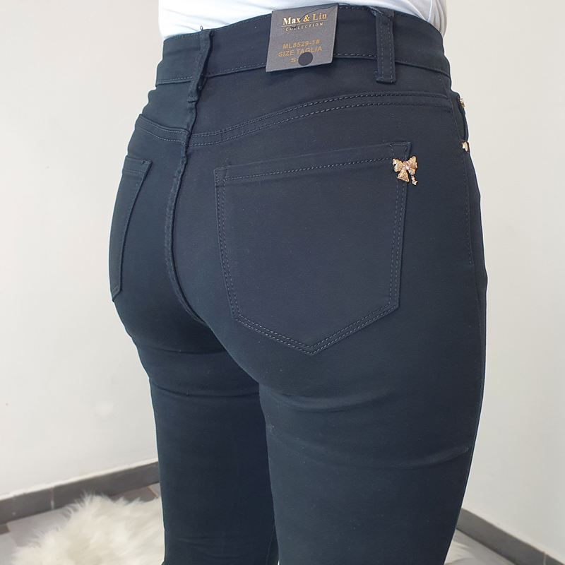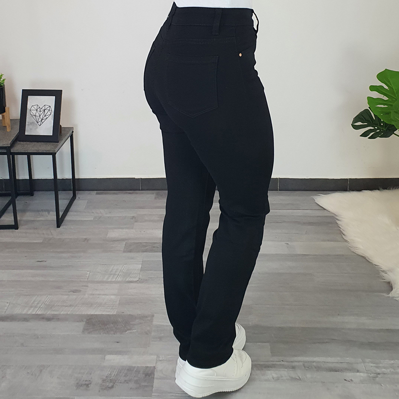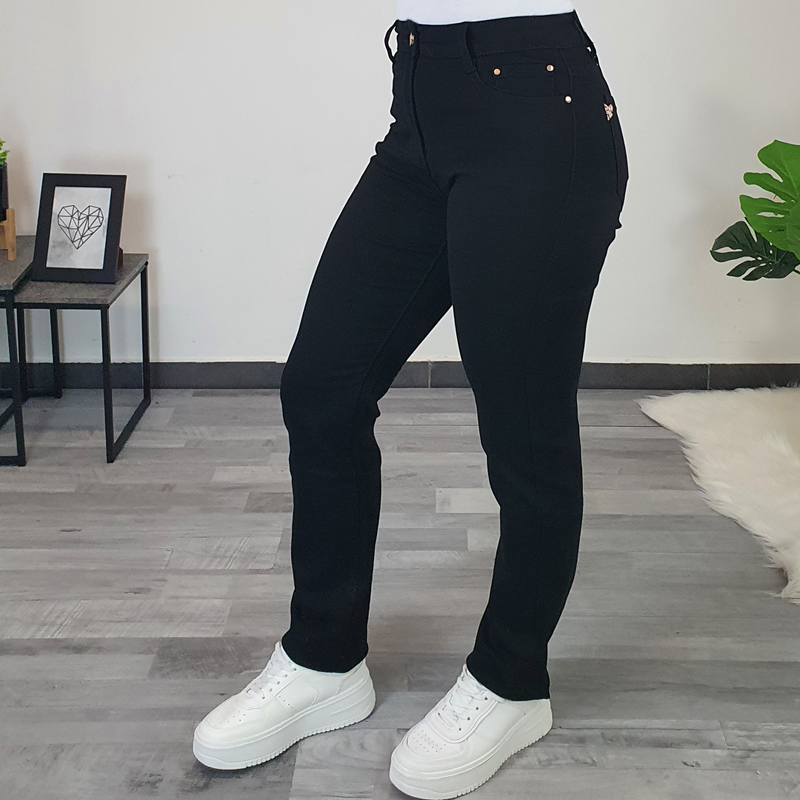 Ženske hlače u crnoj boji. Hlače su napravljene iz kvalitetnoga pamuka i vrlo su elastične. Imaju viši struk, kopčaju patentnim zatvaračem i imaju dva džepa sprijeda i dva džepa sa stražnje strane.