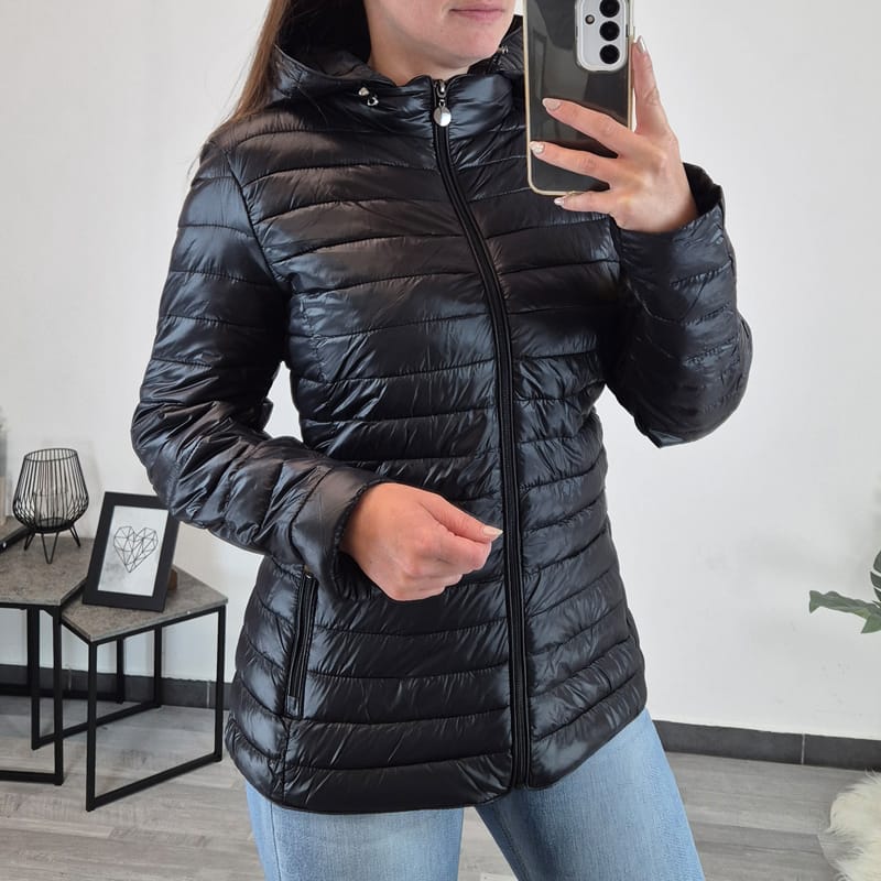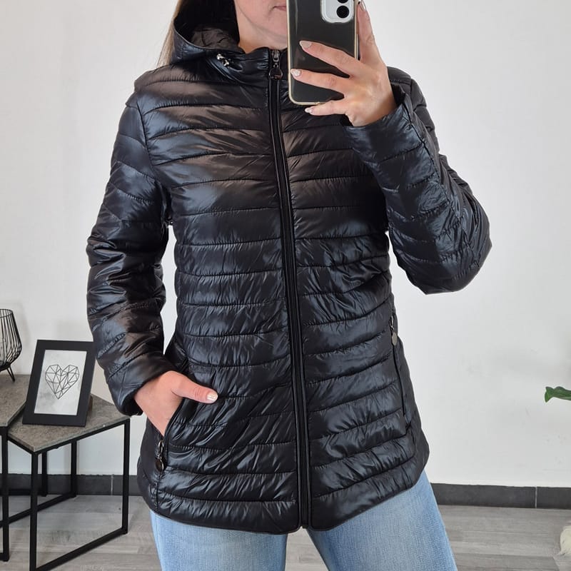 Ženska tanja jakna u crnoj boji s kapuljačom, kapuljača se može skinuti. Jakna je srednje duljine i seže preko bokova. Zakopčava se patentnim zatvaračem po cijeloj duljini. Džepovi se također zatvaraju patentnim zatvaračem. Jakna je dostupna od veličine 40 do 48.