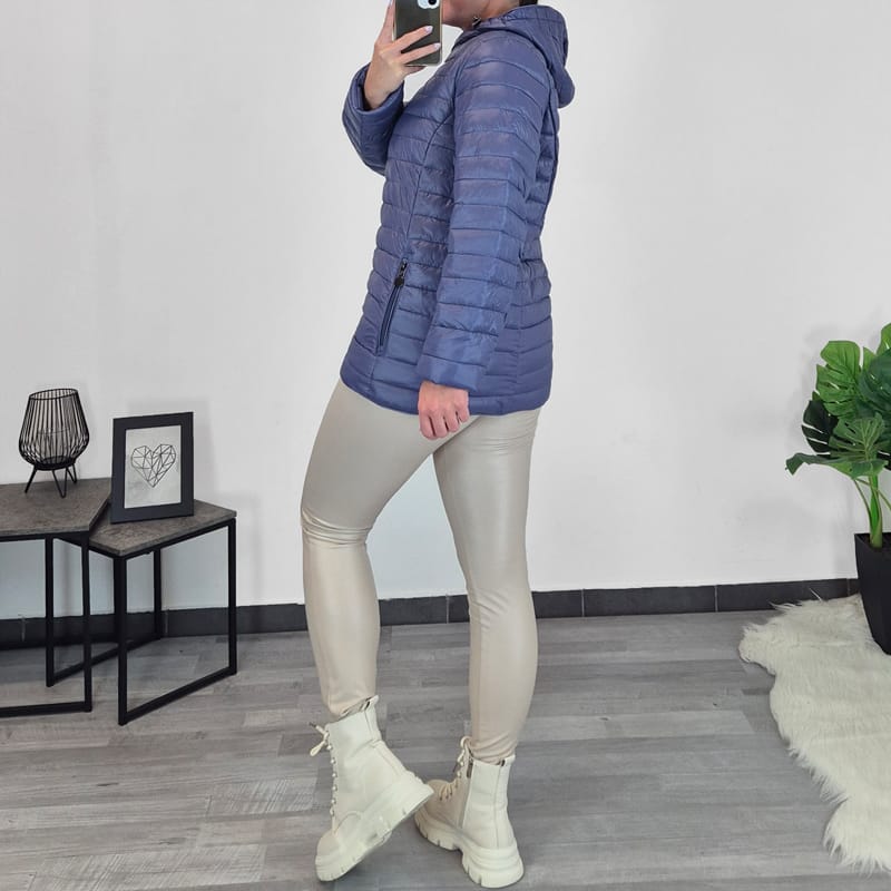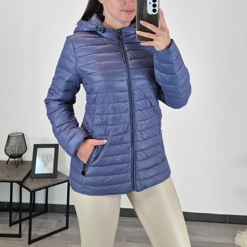 Ženska tanja jakna u plavoj boji s kapuljačom, kapuljača se može skinuti. Jakna je srednje duljine i seže preko bokova. Zakopčava se patentnim zatvaračem po cijeloj duljini. Džepovi se također zatvaraju patentnim zatvaračem. Jakna je dostupna od veličine 40 do 48.