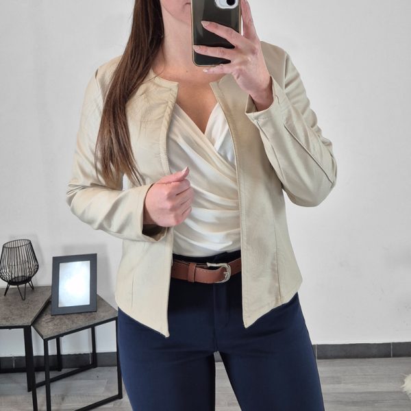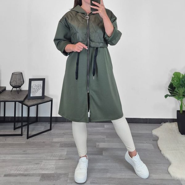Ženska jakna u bež boji. Jakna ima kapuljaču, posebno zanimljiv izgled daje joj kombinacija prošivene jakne u gornjem dijelu. U struku ima vezicu za zatezanje, kojom možete oblikovati jaknu prema svom tijelu. Veličina je univerzalna, odgovara od M do XXL.