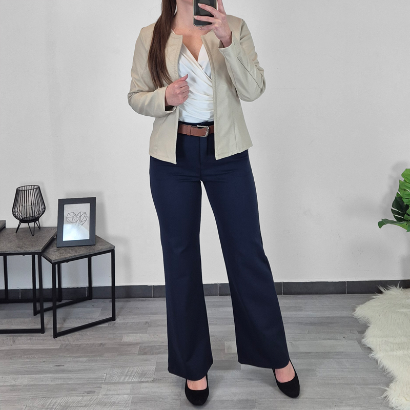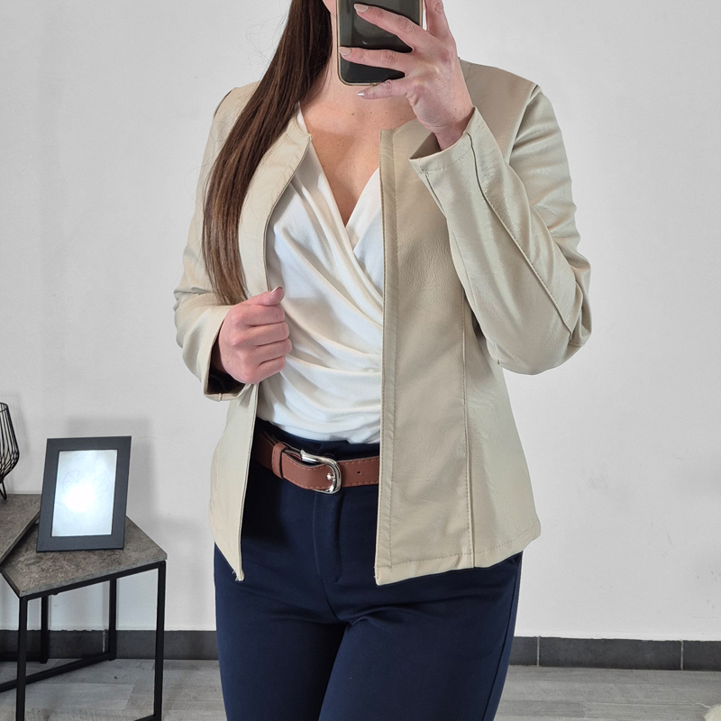 Ženska jakna u bež boji. Kroj jakne je kraći i ne kopča se. Vanjski šavovi u bež boji s prednje i stražnje strane daju posebno zanimljiv izgled. Izrađena je od umjetne kože. Jakna je dostupna od veličine S do XXL.