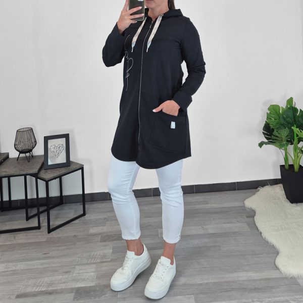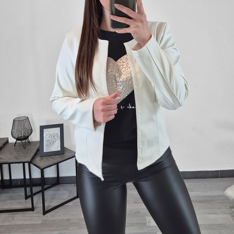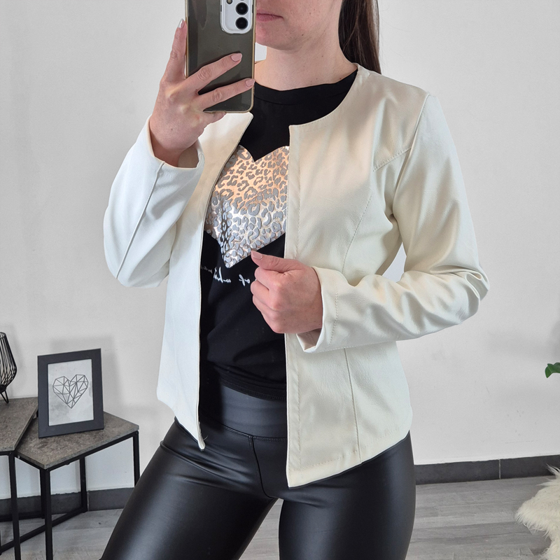 Ženska jakna u bijeloj boji. Kroj jakne je kraći i ne kopča se. Vanjski šavovi u bež boji s prednje i stražnje strane daju posebno zanimljiv izgled. Izrađena je od umjetne kože. Jakna je dostupna od veličine S do XXL.