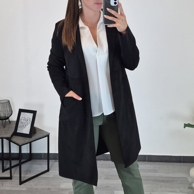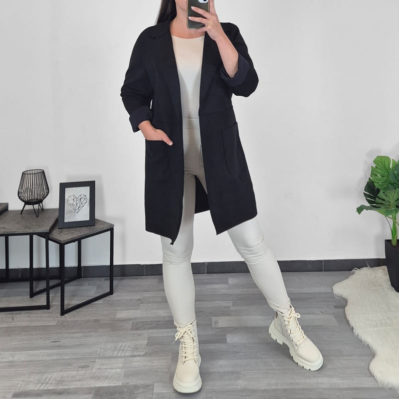 Ženska duga elegantna jakna u crnoj boji. Jakna ima duge rukave, možete ih zavrnuti do 3/4 duljine. Izrađena je od mekanog materijala koji se ne gužva. Veličina je univerzalna, odgovara za S, M, L, XL.