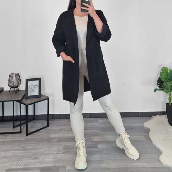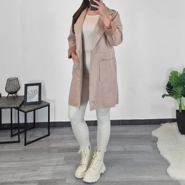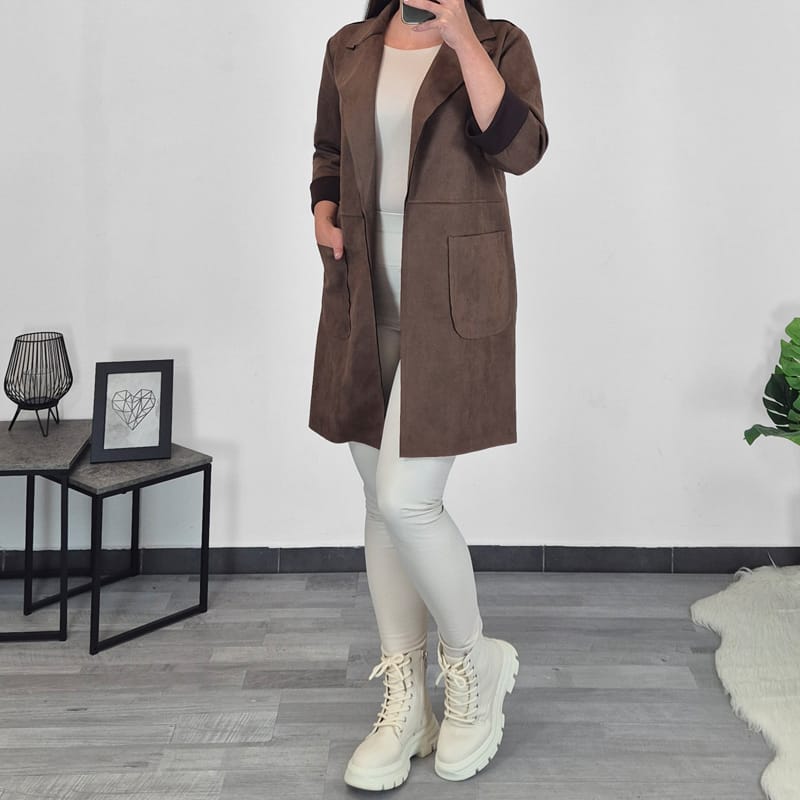 Ženska duga elegantna jakna u smeđoj boji. Jakna ima duge rukave, možete ih zavrnuti do 3/4 duljine. Izrađena je od mekanog materijala koji se ne gužva. Veličina je univerzalna, odgovara za S, M, L, XL.