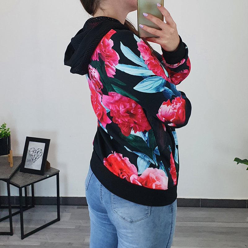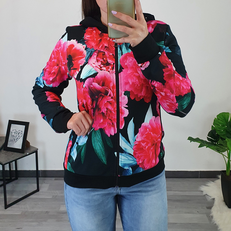 Sportska pamučni džemper Ajda s cvijetnim uzorkom. Jakna se zatvara patentni zatvaračem, ima dva bočna džepa i mrežastu kapuljaču u crnoj boji. Jakna je izrađena od mješavine pamuka i poliestera i ugodna je za nošenje. Dostupna od veličine 38/40 do veličine 50/52.