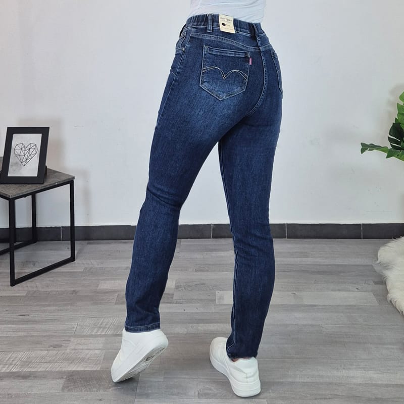 Ženski tamniji jeans s elastikom. Hlače su elastične i udobne za nošenje. Imajo dva džepa na prednoj strani i dva na zadnoj strani.