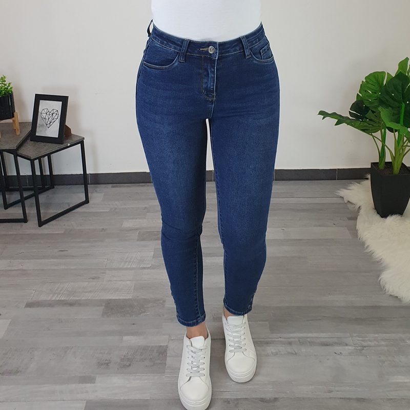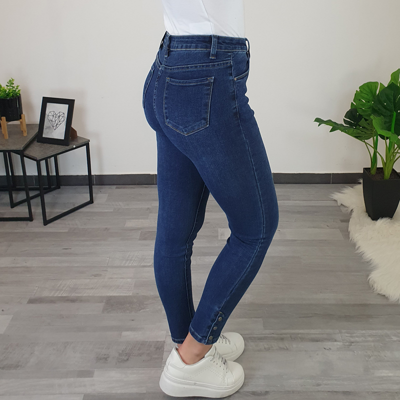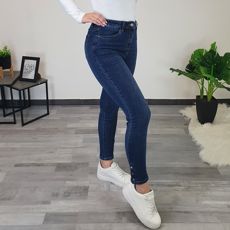 Ženske traperice u tamnoj jeans boji. Hlače su izrađene od visokokvalitetnoga pamuka koji pruža potpunu udobnost tijekom nošenja. Hlače se kopčaju patentnim zatvaračem i imaju dva džepa sprijeda i dva džepa sa stražnje strane. Nogavice su uske, s vanjske strane nogavica dodana su tri ukrasna gumba.