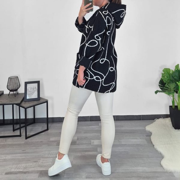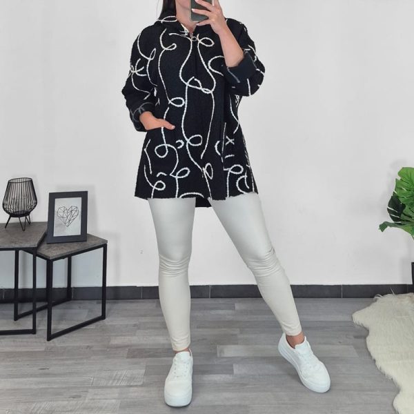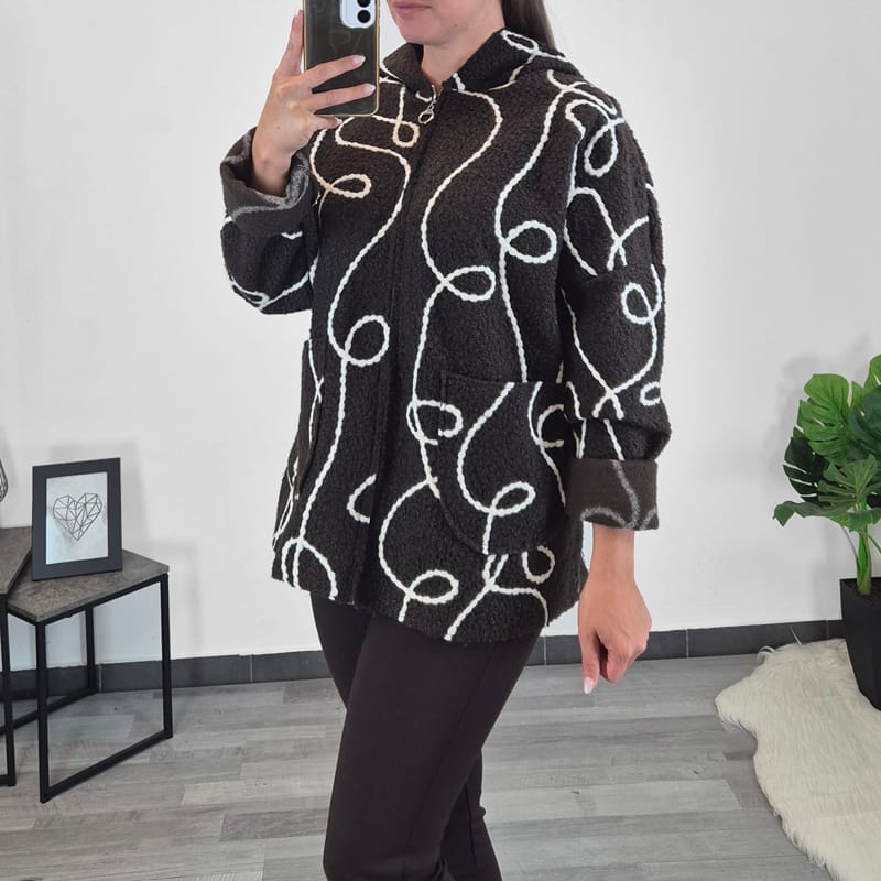 Moderna ženska jakna u smeđoj boji s bijelim uzorkom. Jakna nije podstavljena, ali ima kapuljaču i dva džepa sprijeda. Veličina je univerzalna, odgovara za M do 2XL.