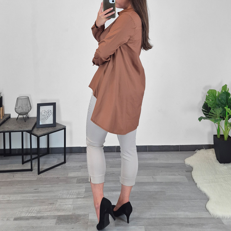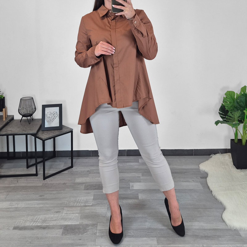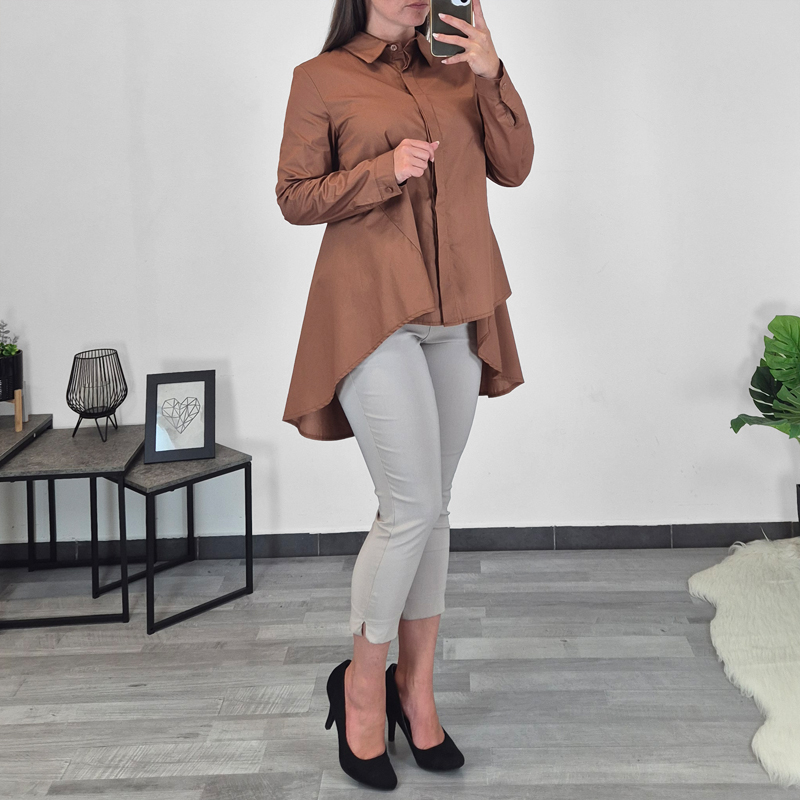 Ženska modna košulja u smeđoj boji. Košulja je šireg kroja i straga produžena. Rukavi su dugi. Veličina je univerzalna, odgovara veličinama od S do L.