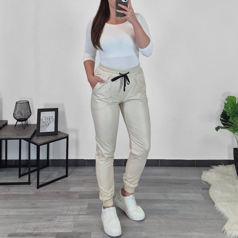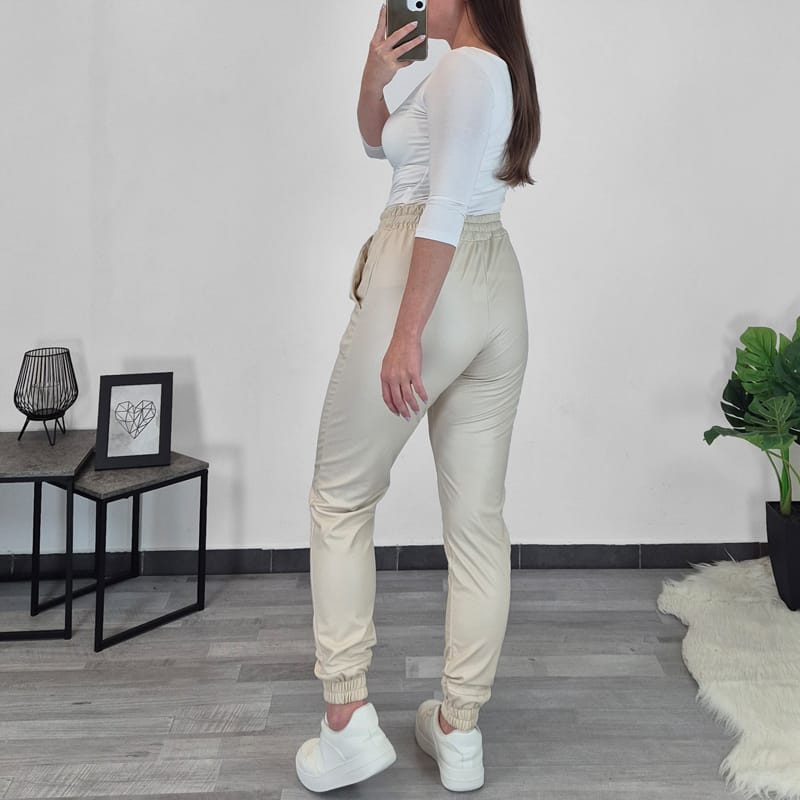 Ženske hlače od imitacije kože u bež boji. Hlače su izrađene od elastičnog materijala i vrlo su udobne, imaju elastiku i vezicu u struku, a sprijeda su dodana dva dodatna džepa. Nogavice su duge, završavaju patentom. Hlače su s unutarnje strane blago krznene i prikladne su i za hladnije dane.
