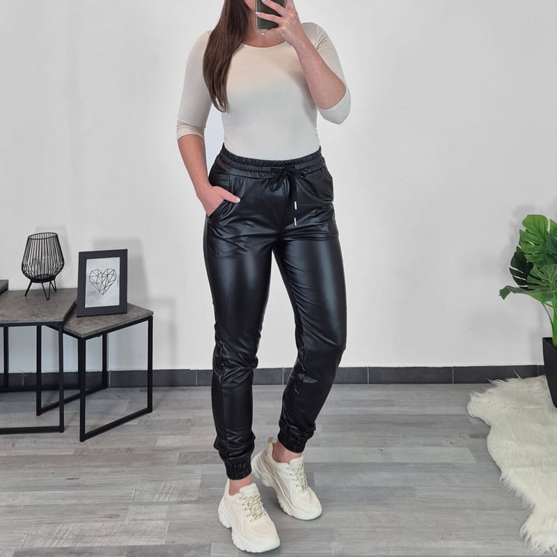 Ženske hlače od imitacije kože u crnoj boji. Hlače su izrađene od elastičnog materijala i vrlo su udobne, imaju elastiku i vezicu u struku, a sprijeda su dodana dva dodatna džepa. Nogavice su duge, završavaju patentom. Hlače su s unutarnje strane blago krznene i prikladne su i za hladnije dane.