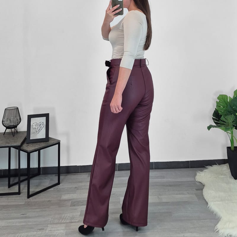Ženske elegantne hlače u bordo boji. Hlače imaju visok struk, nogavice su široke i duge. Na prednjoj strani imaju dva džepa. Hlače su vrlo elastične i ugodne za nošenje. Dodan je i remen.