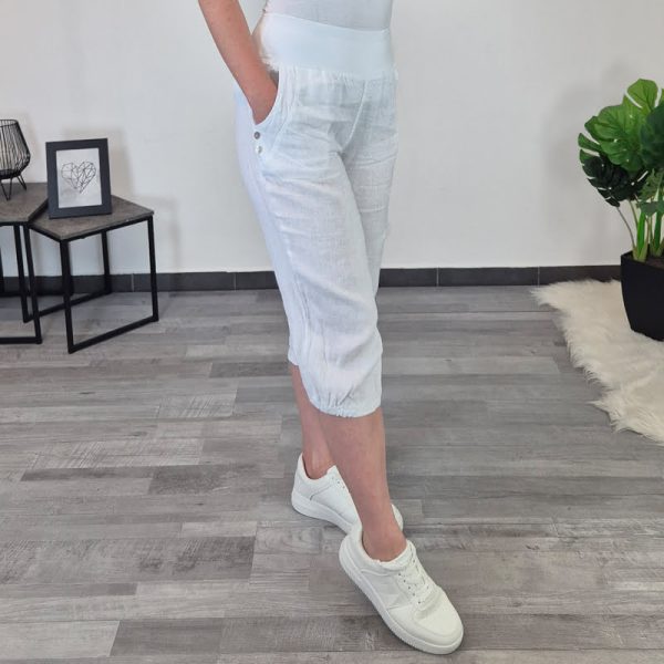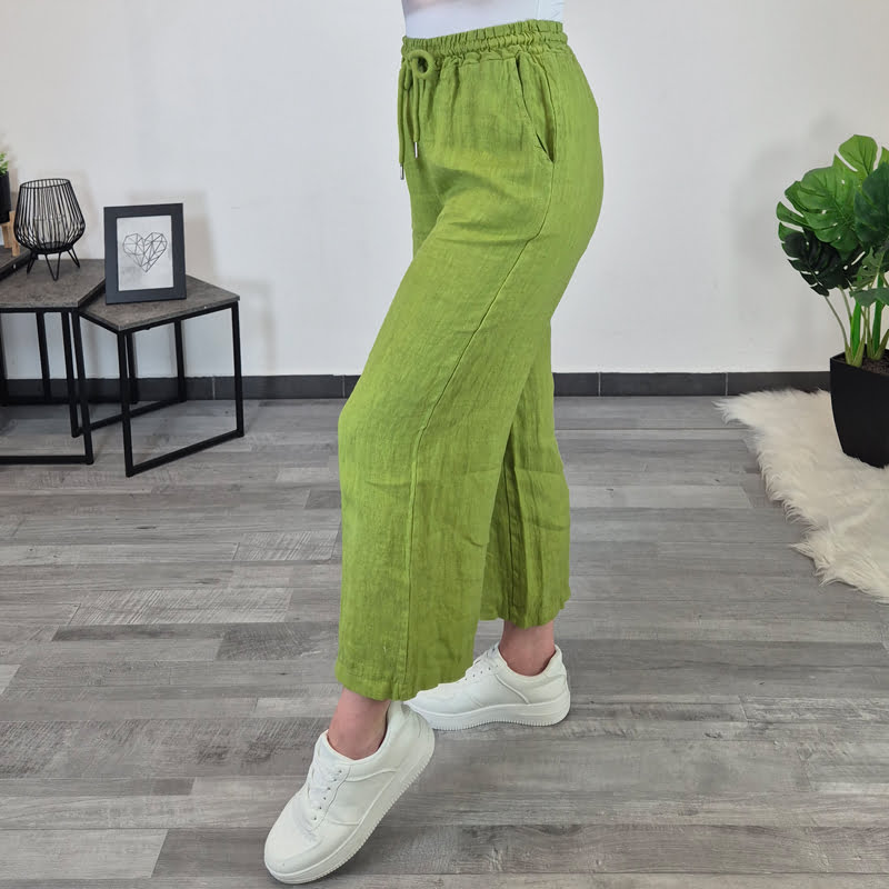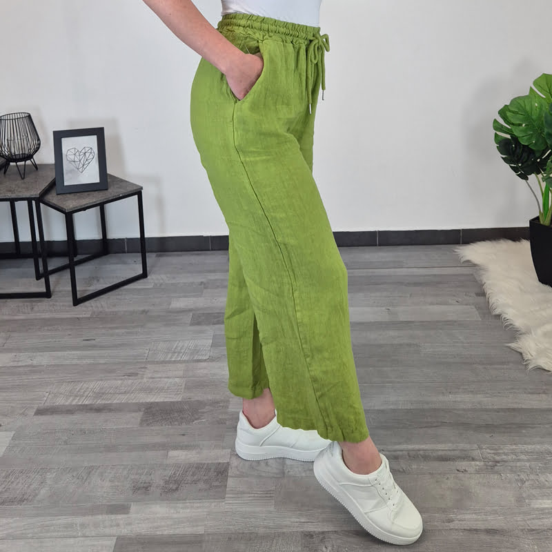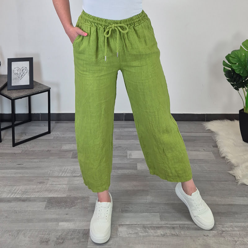 Ženske hlače izrađene su od 100% lana i zelene su boje. Hlače su tanke i lagane, pogodne za vruće ljetne dane. Hlače imaju elastični struk i vezicu, imaju dodatne džepove sa strane, hlače su dužine 7/8.