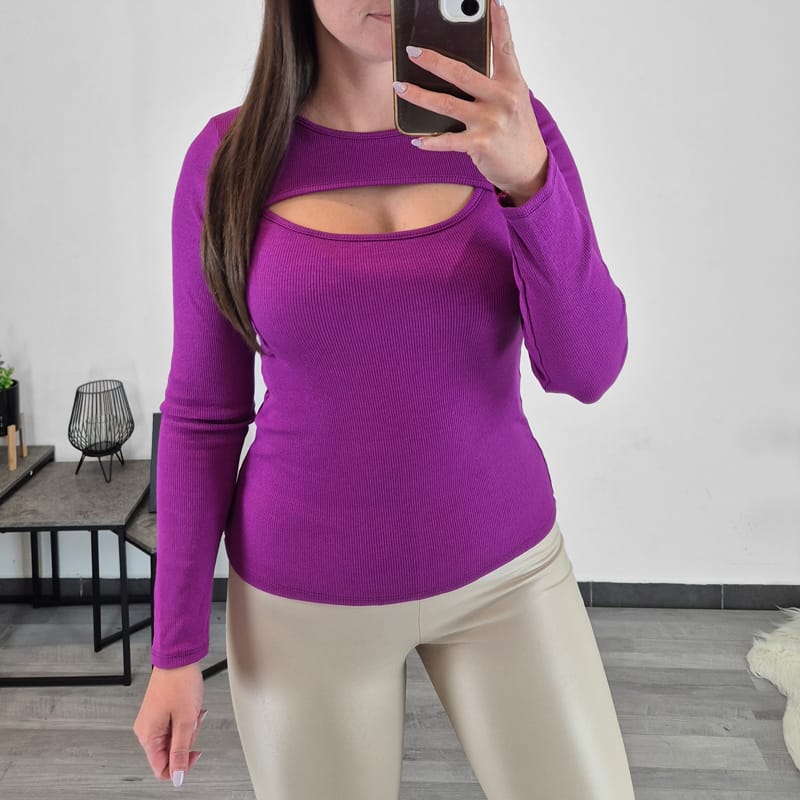 Modna ženska rebrasta majica u ljubičastoj boji. Majica ima duge rukave i prekrasan dekolte. Izrađena je od mješavine viskoze i udobna je za nošenje. Veličina je univerzalna, odgovara za S do L.