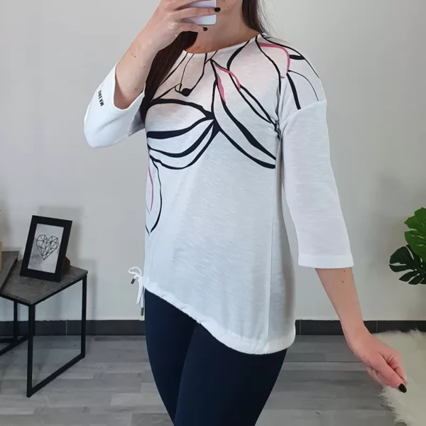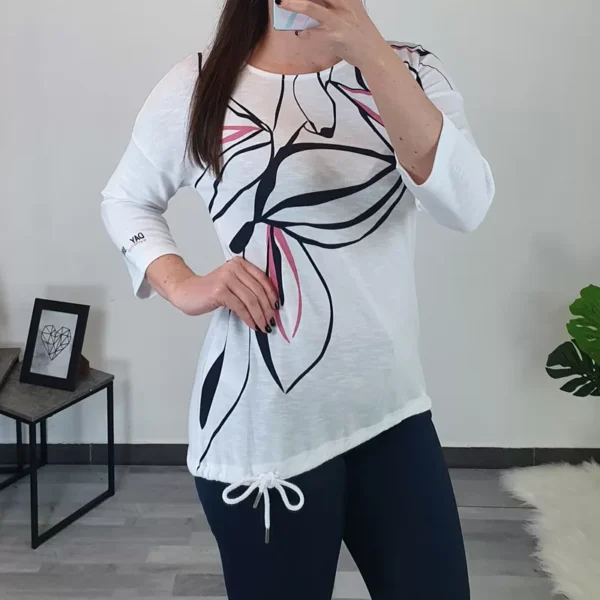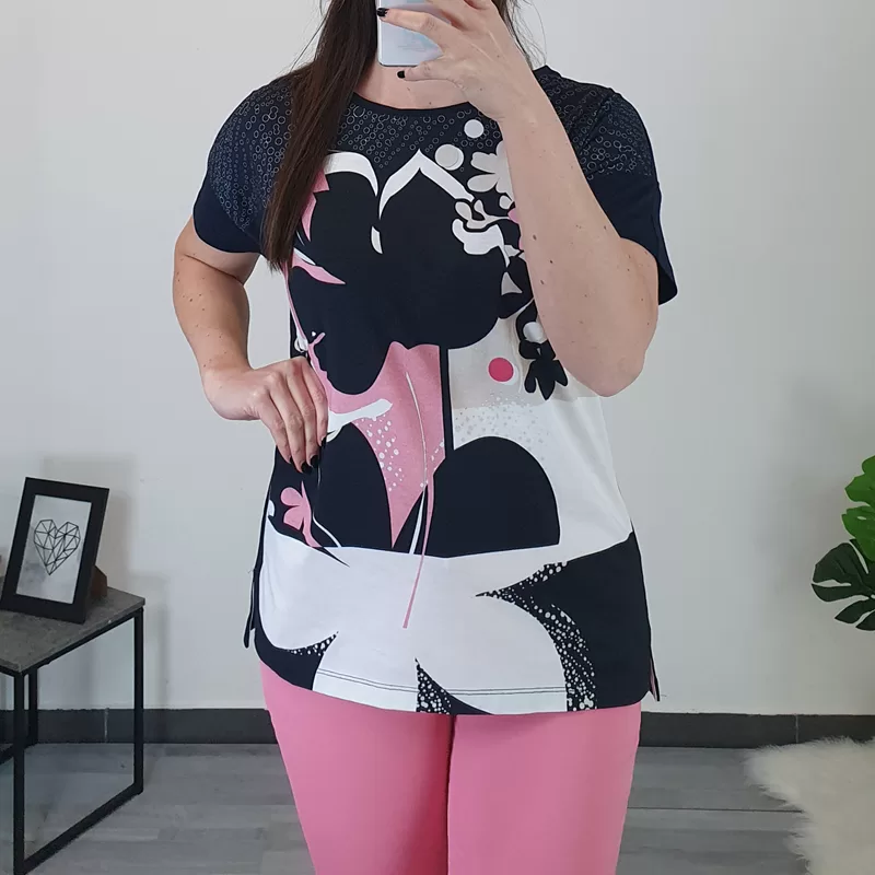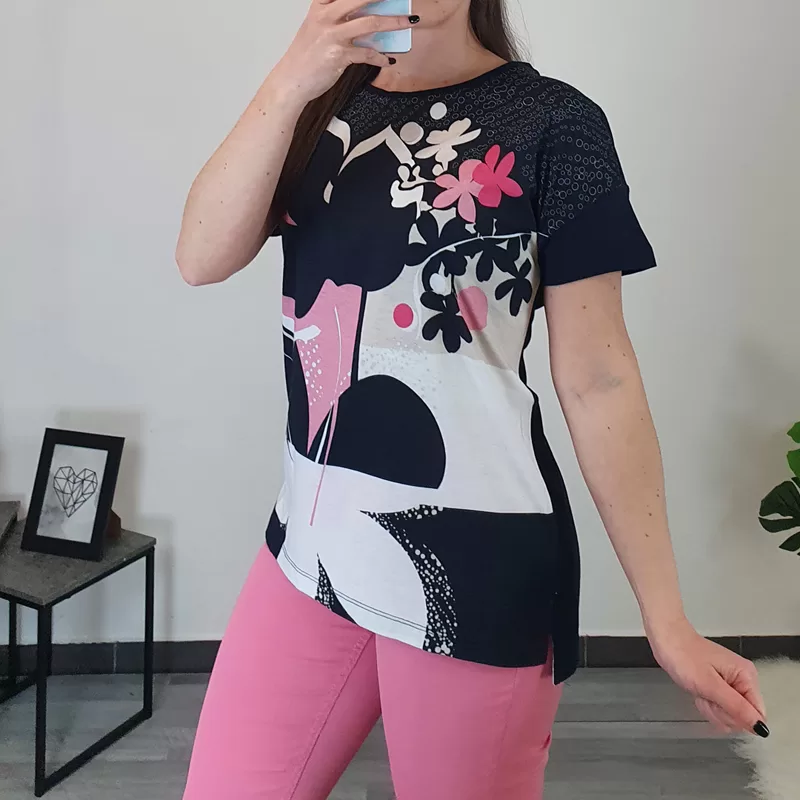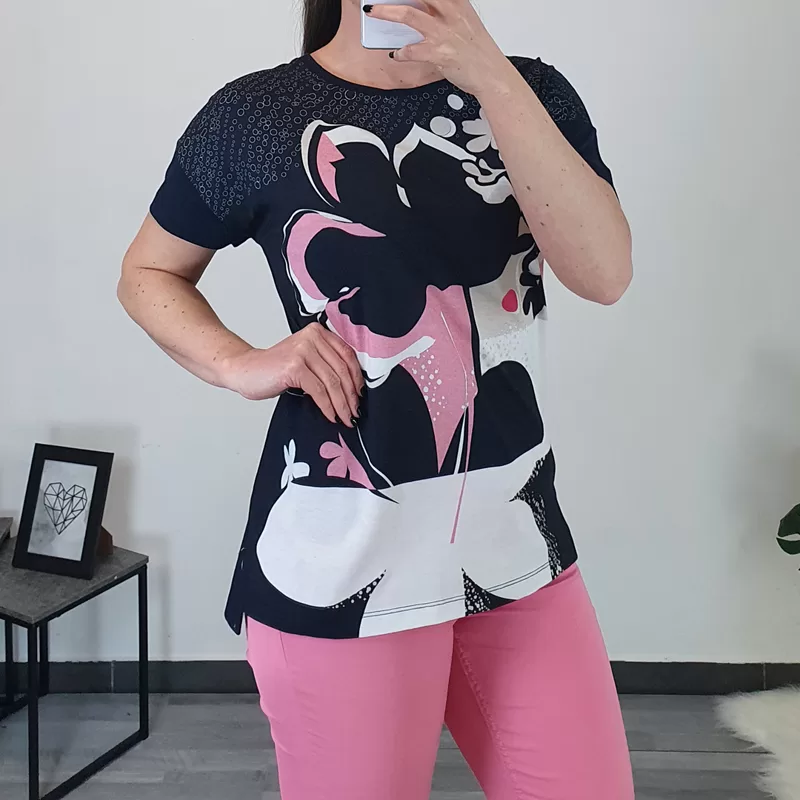 Ženska majica Kenny S. Majica je kratkih rukava, kroj majice je širi i lijepo pada. Majica je u osnovi tamnoplava, s dodanim uzorkom u bijeloj i ružičastoj boji s prednje strane. Izrađena je od visokokvalitetne mješavine pamuka i modala, zato je pogodna za ljetne dane. Dostupna od broja 38 do 48.