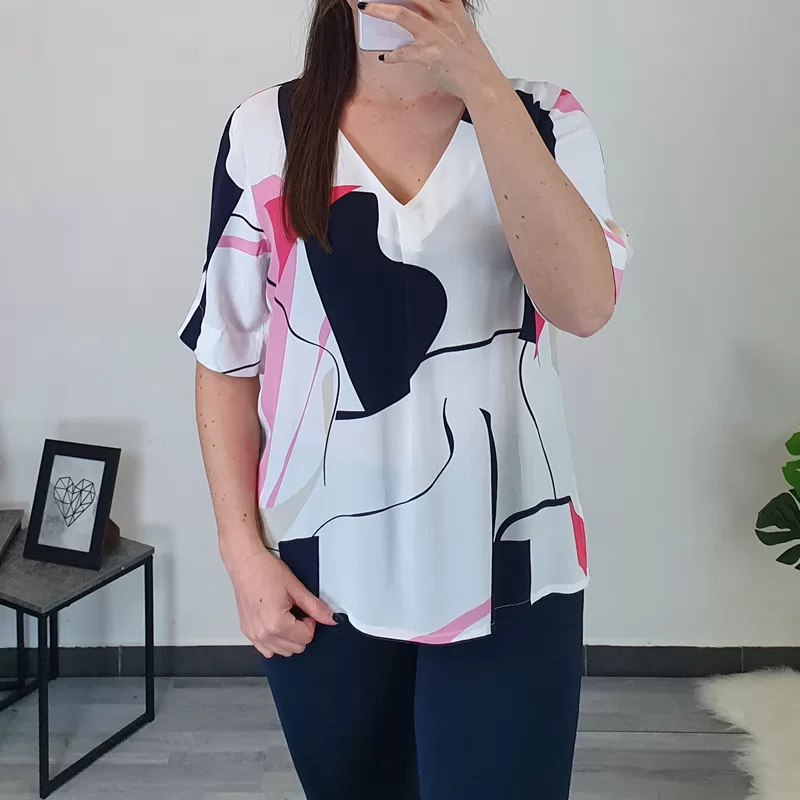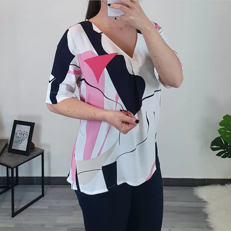 Ženska bluza Kenny S. Majica ima 3/4 rukave i V izrez, kroj majice je širok i lijepo pada uz tijelo. U osnovi je bijele boje, u kombinaciji s ružičastom i tamnoplavom. Bluza je izrađena od visokokvalitetne viskoze koja je lagana i prozračna, pogodna je za tople dane.
