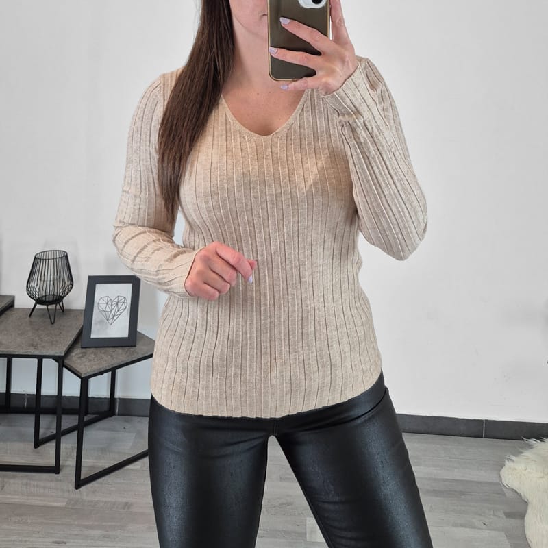Modna ženska rebrasta majica u bež boji. Majica ima duge rukave i prekrasan V-izrez. Izrađena je od mješavine viskoze i udobna za nošenje. Veličina je univerzalna, pogodna za S do L.