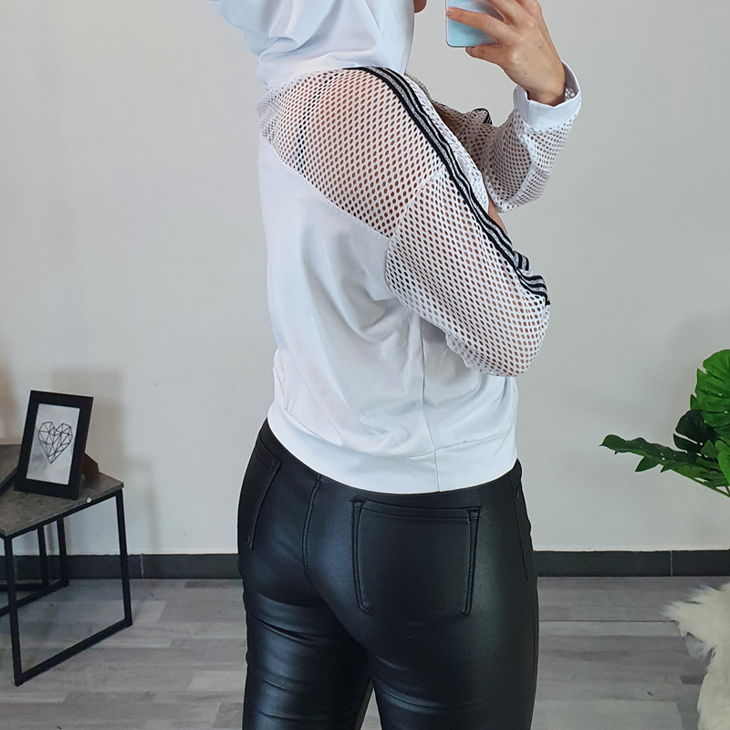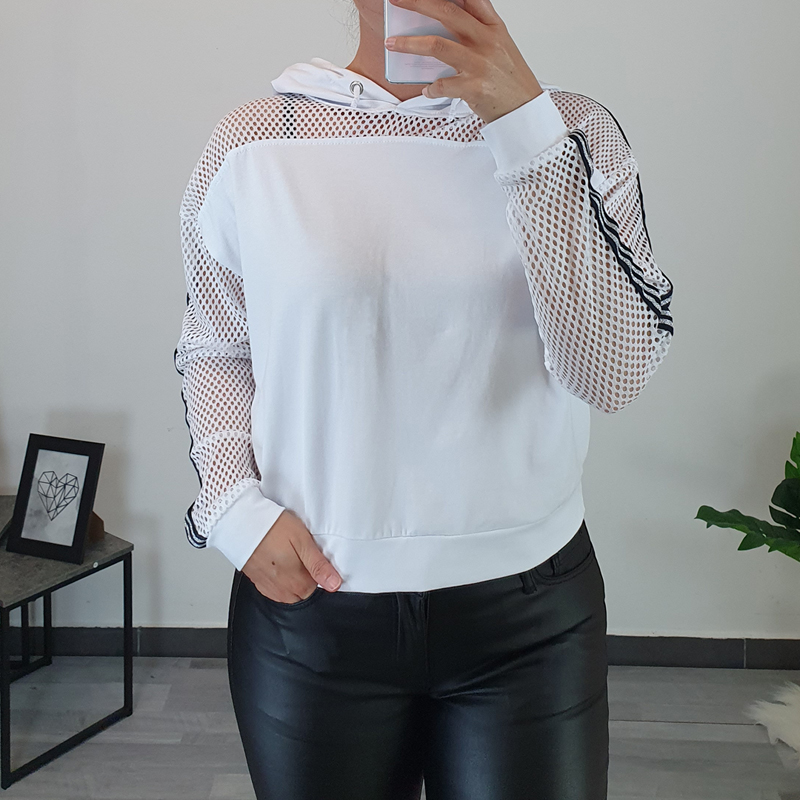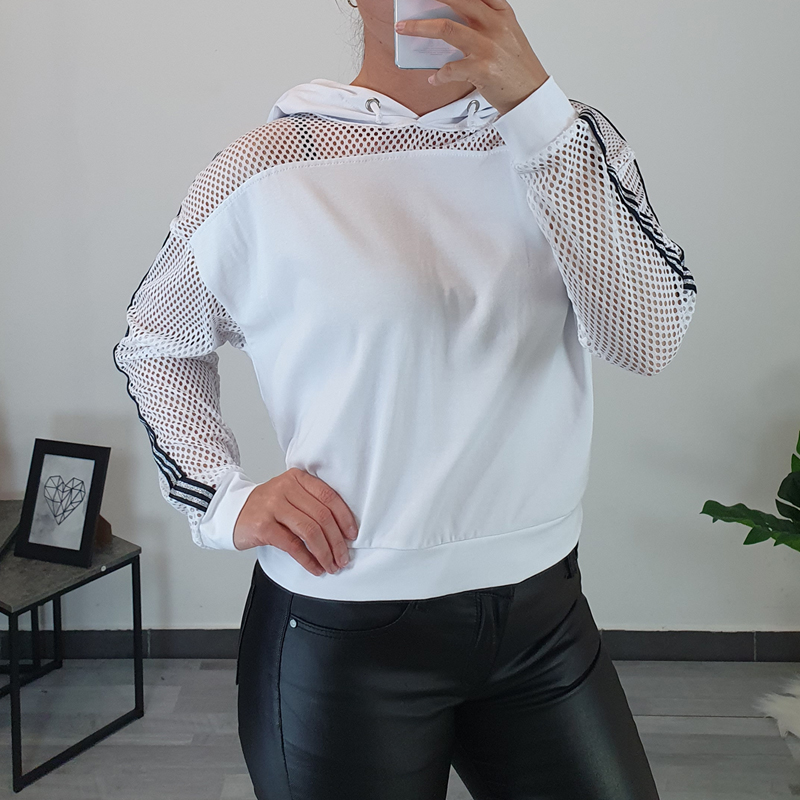 Ženska sportska majica Nina sa kapuljačom u bijeli boji. Majica je širokog i kratkog kroja, završava se patentom. Leđa i rukavi izrađeni su od mrežaste tkanine što majici daje atraktivan izgled. Majica je prikladna za sva godišnja doba, ispod možete nositi majico sa kratkim ili dugim rukavima, ili je možete nositi samostalno. Majica je izrađena od visokokvalitetnoga pamuka i ugodna je za nošenje, dostupna je od 36 do 44.