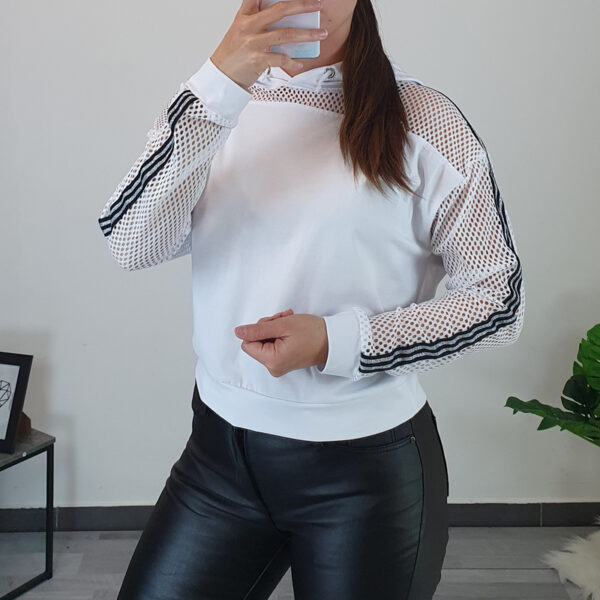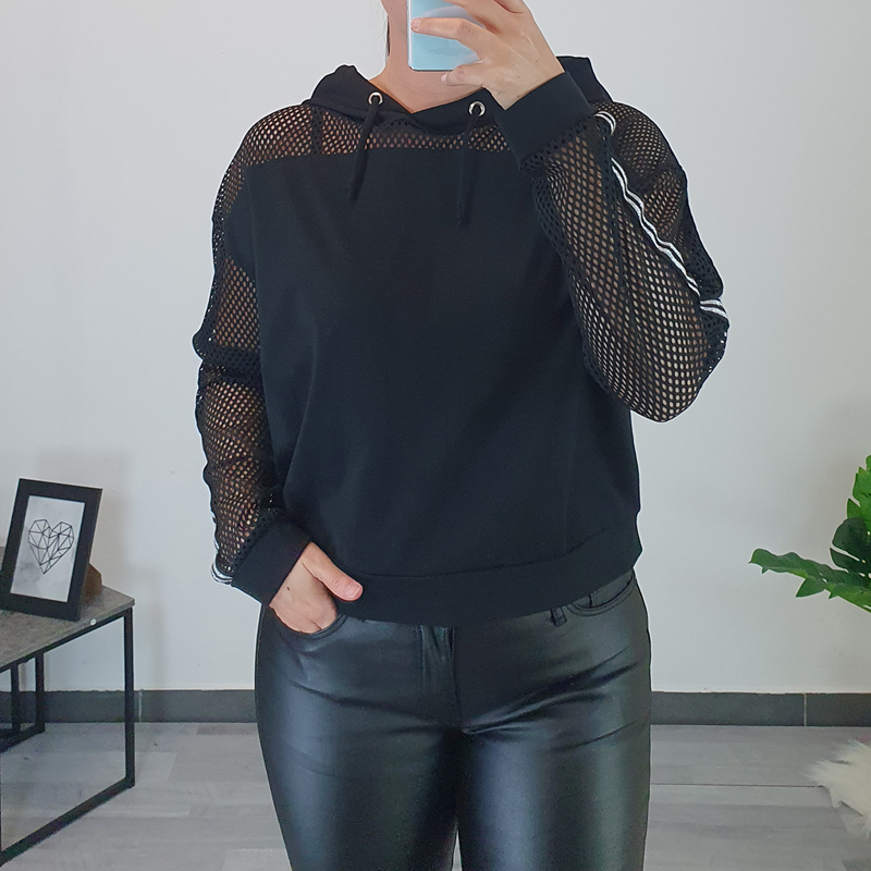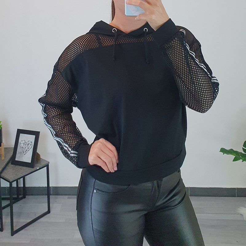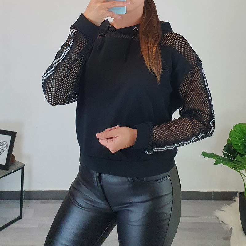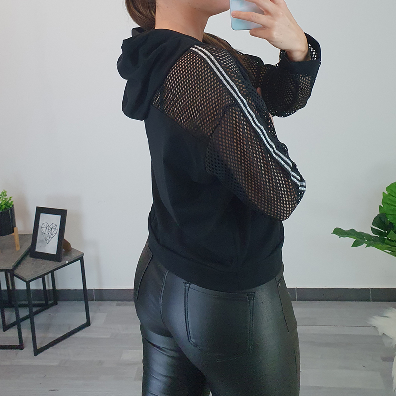 Ženska sportska majica Nina sa kapuljačom u crnoj boji. Majica je širokog i kratkog kroja, završava se patentom. Leđa i rukavi izrađeni su od mrežaste tkanine što majici daje atraktivan izgled. Majica je prikladna za sva godišnja doba, ispod možete nositi majico sa kratkim ili dugim rukavima, ili je možete nositi samostalno. Majica je izrađena od visokokvalitetnoga pamuka i ugodna je za nošenje, dostupna je od 36 do 44.