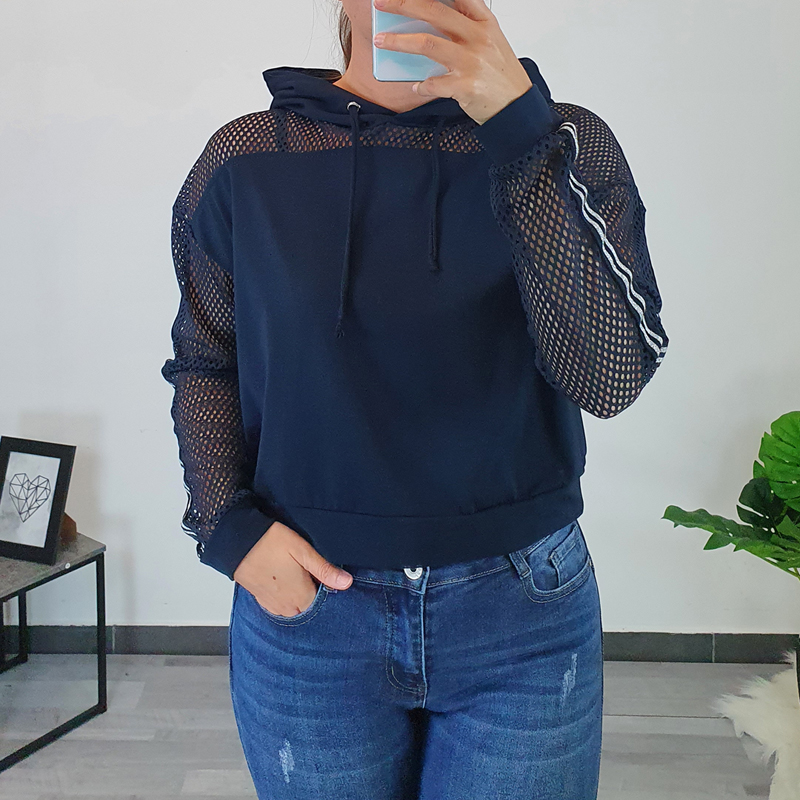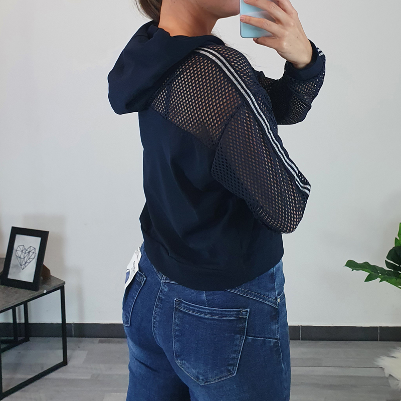 Ženska sportska majica Nina sa kapuljačom u tamnoplavoj boji. Majica je širokog i kratkog kroja, završava se patentom. Leđa i rukavi izrađeni su od mrežaste tkanine što majici daje atraktivan izgled. Majica je prikladna za sva godišnja doba, ispod možete nositi majico sa kratkim ili dugim rukavima, ili je možete nositi samostalno. Majica je izrađena od visokokvalitetnoga pamuka i ugodna je za nošenje, dostupna je od 36 do 44.