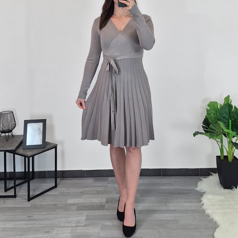 Ženska haljina, pletivo, pogodna za hladne dane. Mekan je na dodir i ugodan za nošenje, materijal je teži i lijepo pada. Haljina ima duge rukave, V izrez s preklopom. Haljina je šira od struka na dolje, a dodan je i remen od istog materijala.