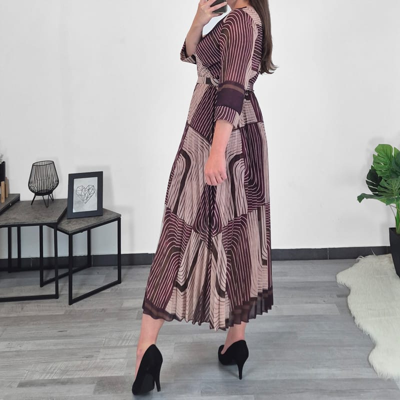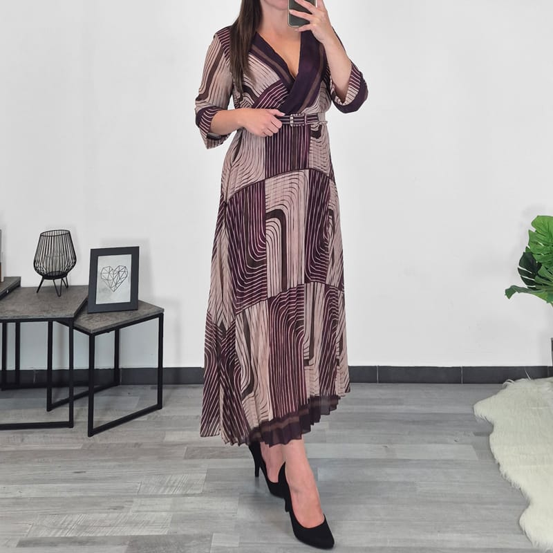 Duga ženska haljina. Haljina je izrađena od prozirne tkanine s uzorkom u bež, bordo i smeđoj boji. Ispod haljine je viskozna podstava koja doseže do koljena. Rukavi su dugi i prozirni. U struku ima elastiku, pa se haljina lijepo prilagođava vašoj figuri. Priložen je i remen. Veličina je univerzalna, odgovara veličinama od S do L.