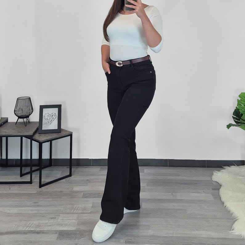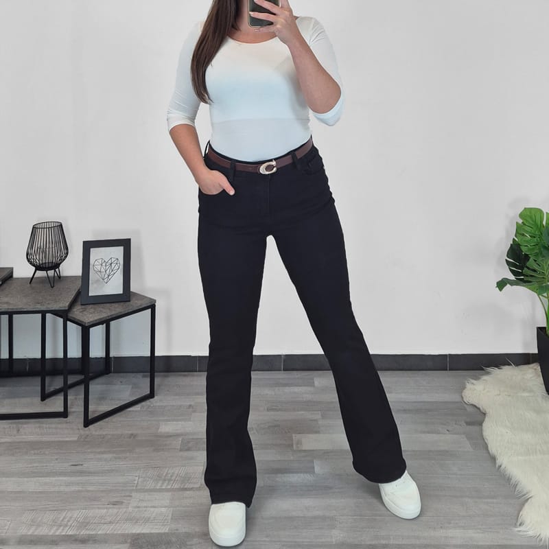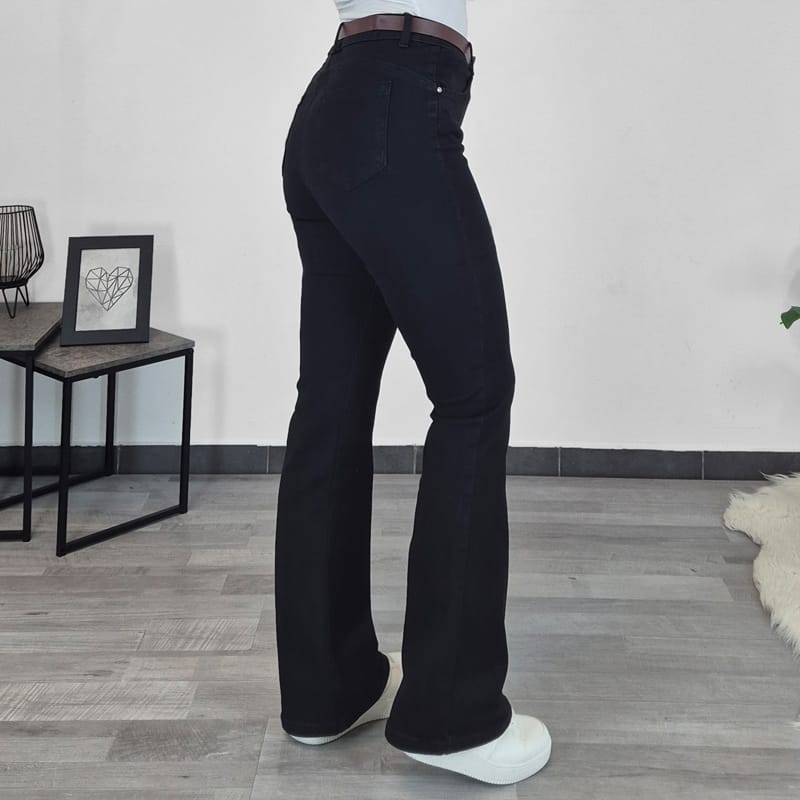 Ženske push up hlače na zvonu u crnoj boji. Hlače su vrlo elastične i udobne za nošenje. Imaju viši struk, dva džepa sprijeda i dva džepa straga. Nogavice su uske u području bedara, a široke pri dnu. Veličine su od 36 do 46. Hlače ćete savršeno kombinirati s vašom omiljenom odjećom.
