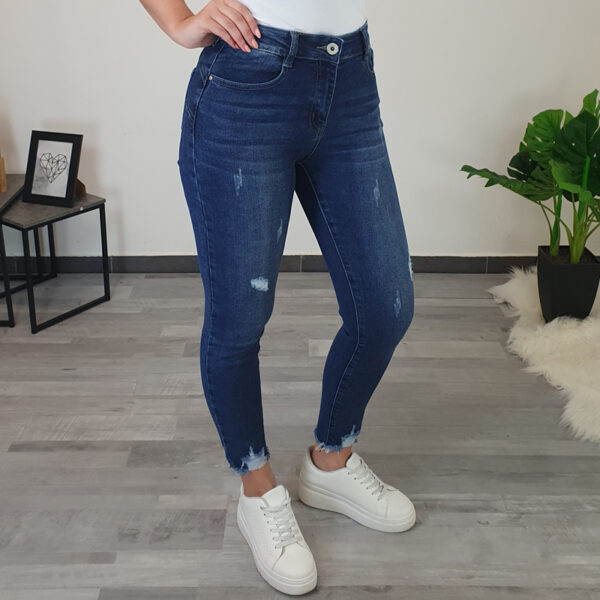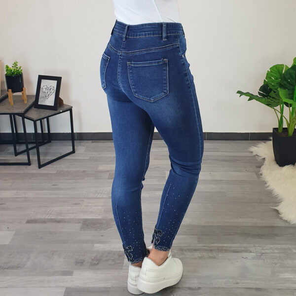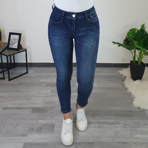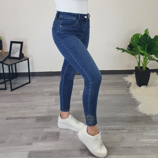 Ženske traperice u tamnoj jeans boji. Hlače su izrađene od od rastezljivog pamuka koji pruža potpunu udobnost tijekom nošenja. Traperice imaju džepove sprijeda i straga, nogavice su uske. Srebrni dodaci dodani su na prednje džepove i sa strane. Stražnji dio hlača dizajniran je tako da lijepo ističe vašu figuru.