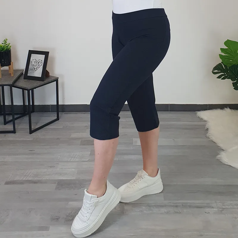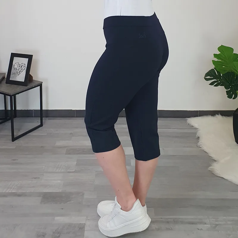 Sportske hlače 208 u tamnoplavoj boji. Hlače imaju viši struk i gumicu u struku, nogavice su nekoliko šire i dužine 3/4. Izrađene su od kvalitetnog pamuka, elastične su i ugodne za nošenje. Dostupne su od broja M do 4XL.