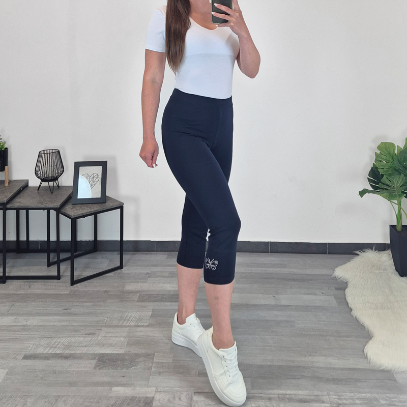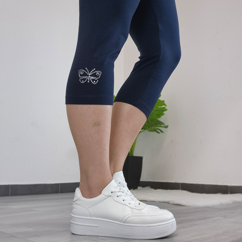 Ženske pamučne tajice u tamno plavoj boji. Tajice imajo viši struk, nogavice su uske in 3/4 dužine. Na kraju nogavica dodan je leptir. Tajice dostupne su od S/36 do 3XL/46.
