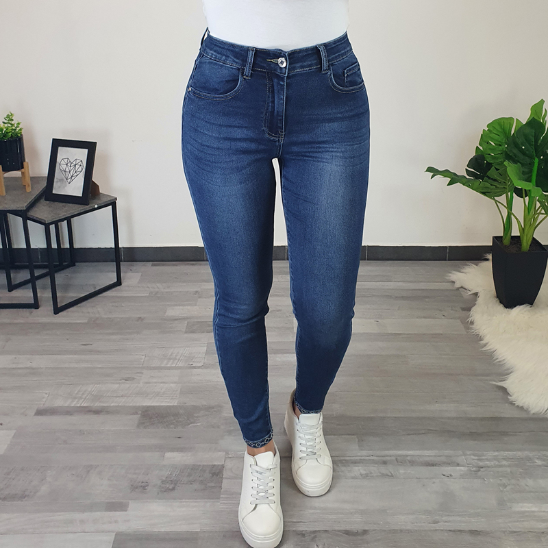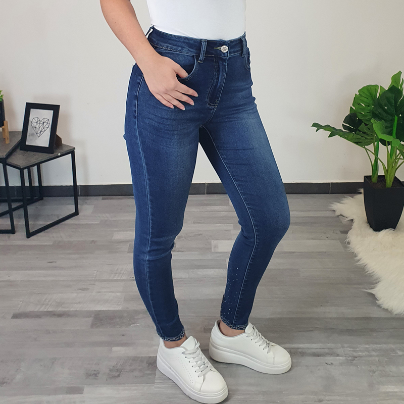 Ženske push up traperice tamnoplave boje. Hlače su vrlo elastične i udobne za nošenje. Na nogavicah su dodani biseri, a straga je dodana mašna od tamnoplavih kamenčića. Hlače se kopčaju patentnim zatvaračem i imaju dva džepa sprijeda i dva džepa sa stražnje strane. Hlače su dostupne u veličinama od 40 do 50.