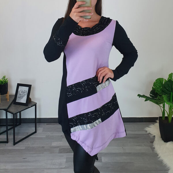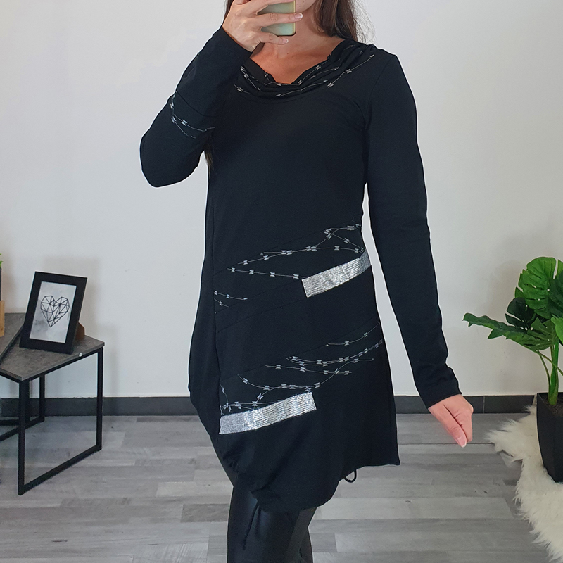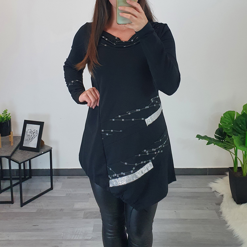 Ženska pamučna tunika Adinka u crnoj boji. Tunika ima duge rukave i krojena je u obliku slova ‘A’ što znači da je u prsnom dijelu uža, a pri dnu šira. Ima skupljeni ovratnik sa srebrnim printom. Također je u kombinaciji sa srebrnom tkaninom na lijevom rukavu i na prednjici. Tunika je pogodna i za jače figure, a dostupna je od veličine 40 do veličine 56.
