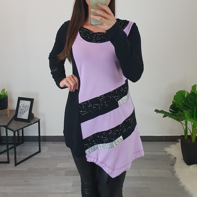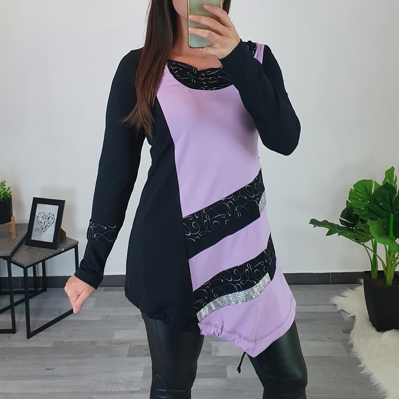 Ženska pamučna tunika Adinka u crnoj boji sa kombinacijom ljubičaste boje. Tunika ima duge rukave i krojena je u obliku slova ‘A’ što znači da je u prsnom dijelu uža, a pri dnu šira. Ima skupljeni ovratnik sa srebrnim printom. Također je u kombinaciji sa srebrnom tkaninom na lijevom rukavu i na prednjici. Tunika je pogodna i za jače figure, a dostupna je od veličine 40 do veličine 56.