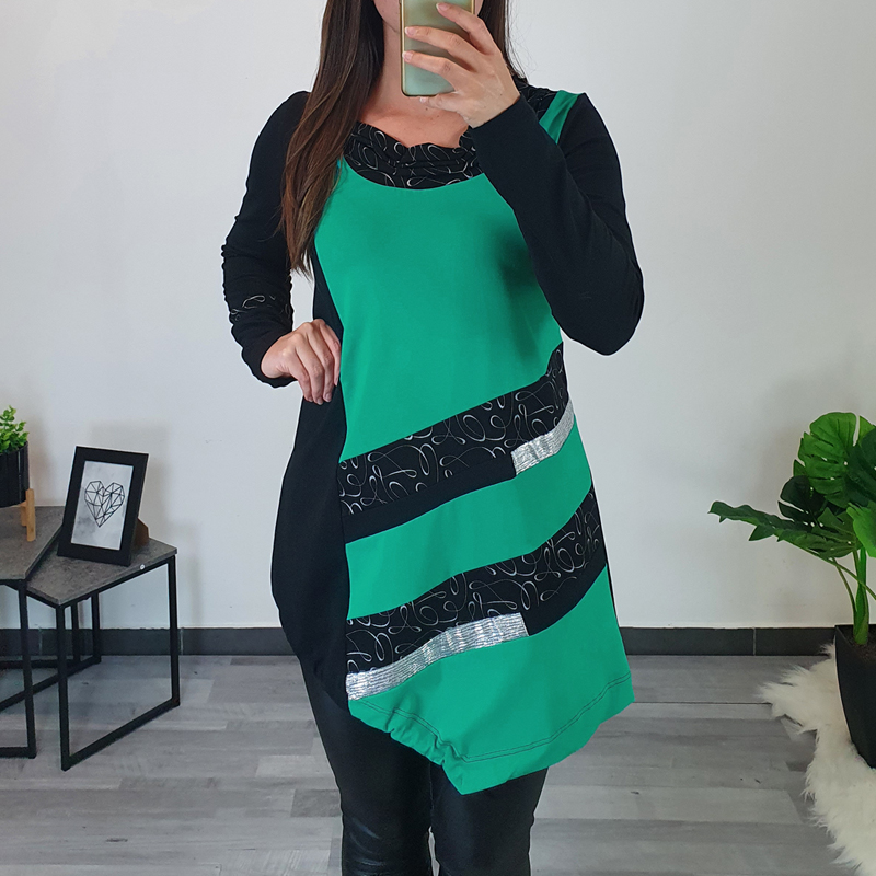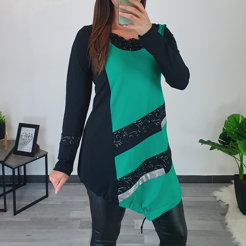 Ženska pamučna tunika Adinka u crnoj boji sa kombinacijom zelene boje. Tunika ima duge rukave i krojena je u obliku slova ‘A’ što znači da je u prsnom dijelu uža, a pri dnu šira. Ima skupljeni ovratnik sa srebrnim printom. Također je u kombinaciji sa srebrnom tkaninom na lijevom rukavu i na prednjici. Tunika je pogodna i za jače figure, a dostupna je od veličine 40 do veličine 52.