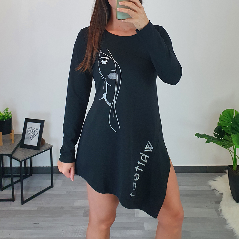 Moderna pamučna tunika Lita u crnoj boji. Tunika je dugih rukava i asimetričnog kroja. S prednje strane ukrašena je printom ženskog lica i natpisom. Izrađena je od visokokvalitetnog pamuka i ugodan je za nošenje. Dostupna veličine od 40 do 46.